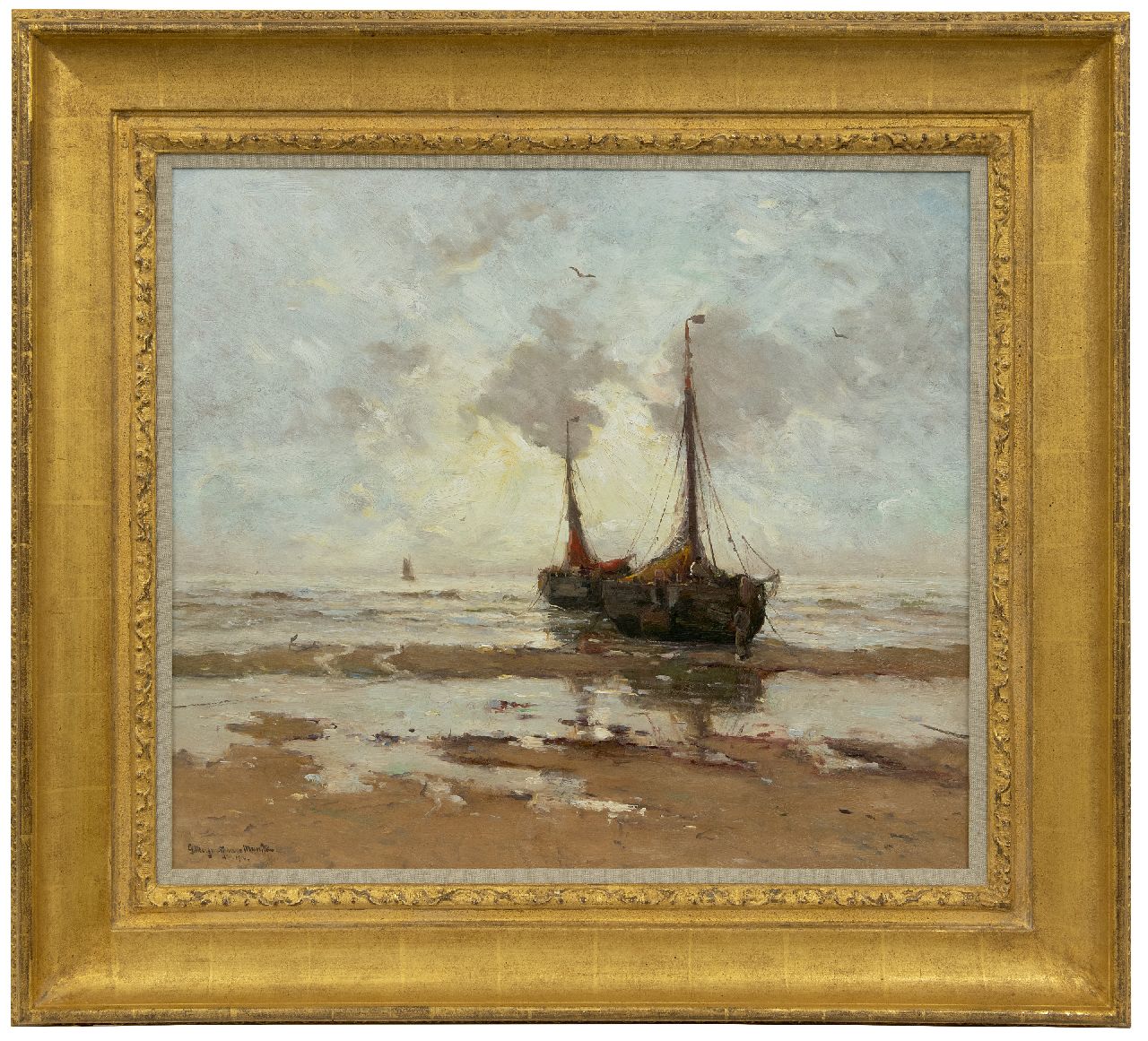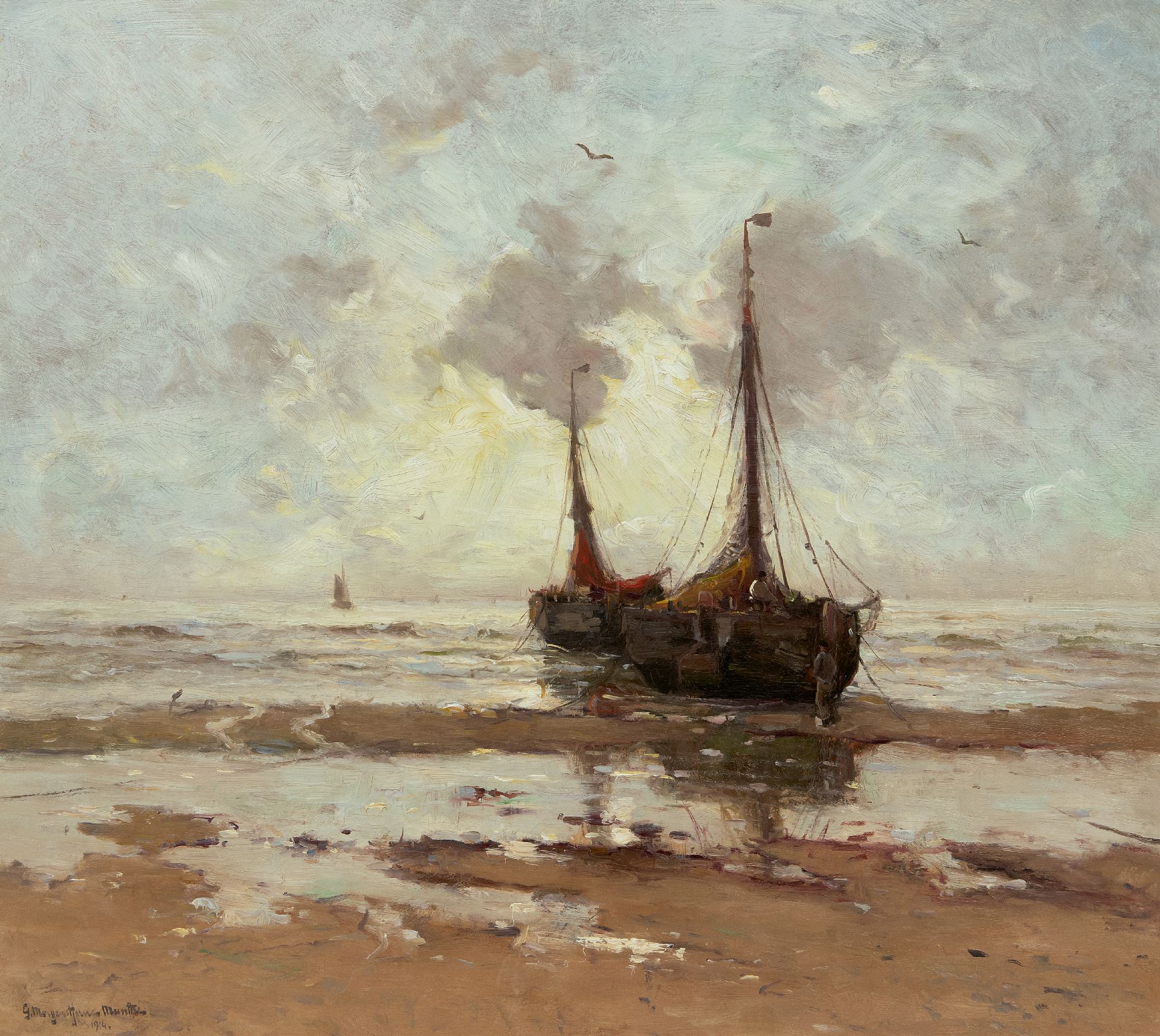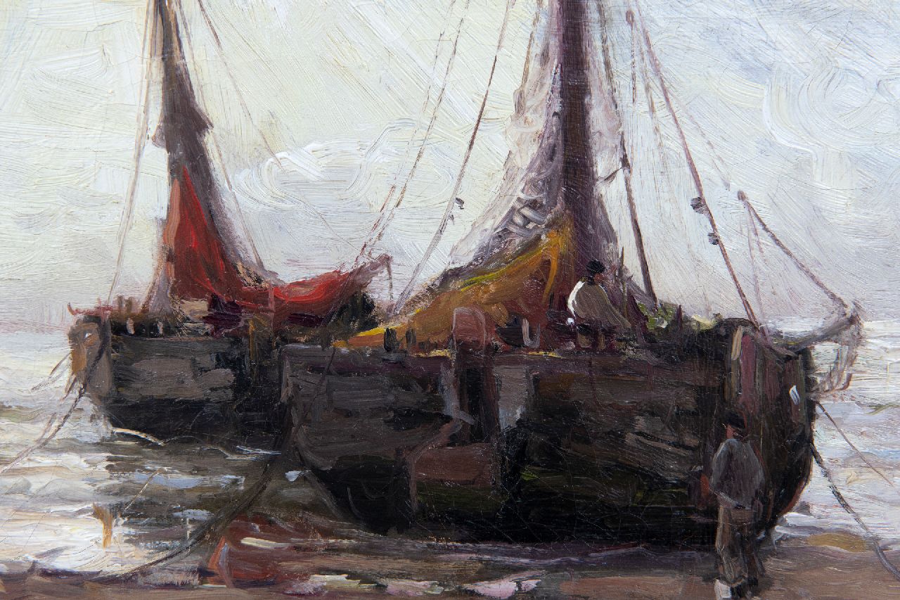 Morgenstjerne Munthe kunstwerk • schilderij • voorheen te koop Bomschuiten voor anker op het strand