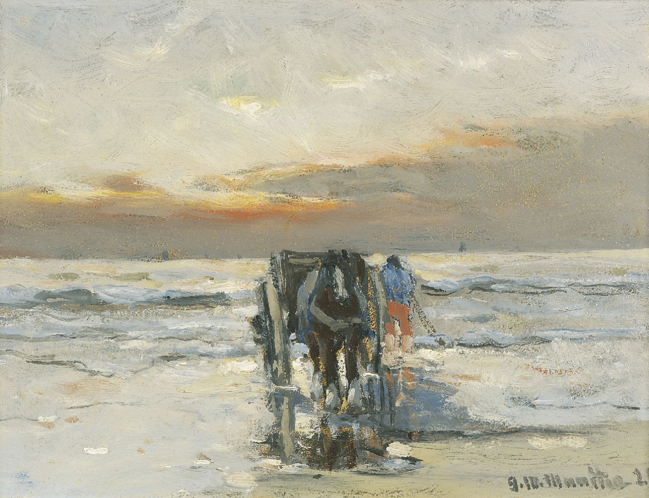 Morgenstjerne Munthe kunstwerk • schilderij • voorheen te koop Schelpenvisser met kar en paard op het strand
