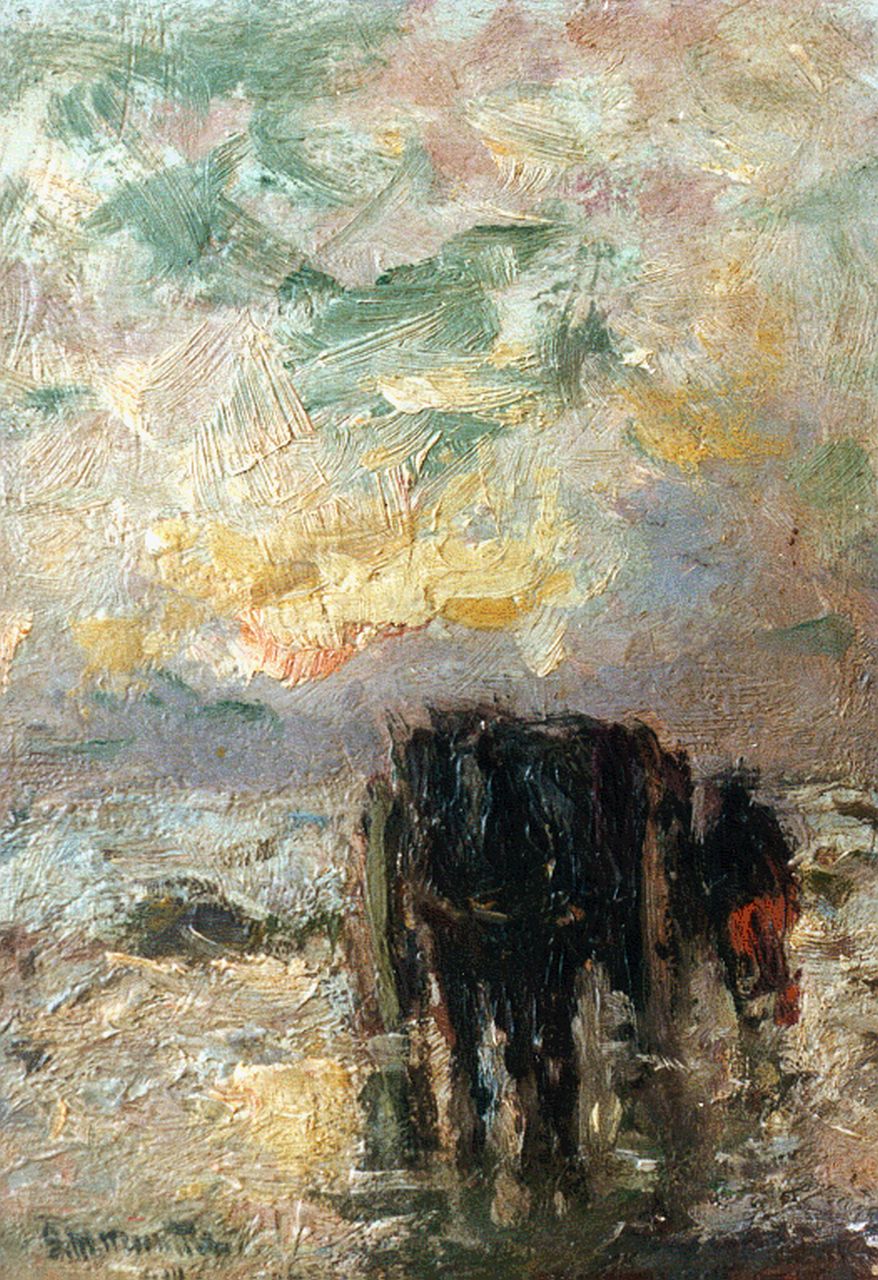 Morgenstjerne Munthe kunstwerk • schilderij • voorheen te koop Schelpenvisser op het strand bij zonsondergang