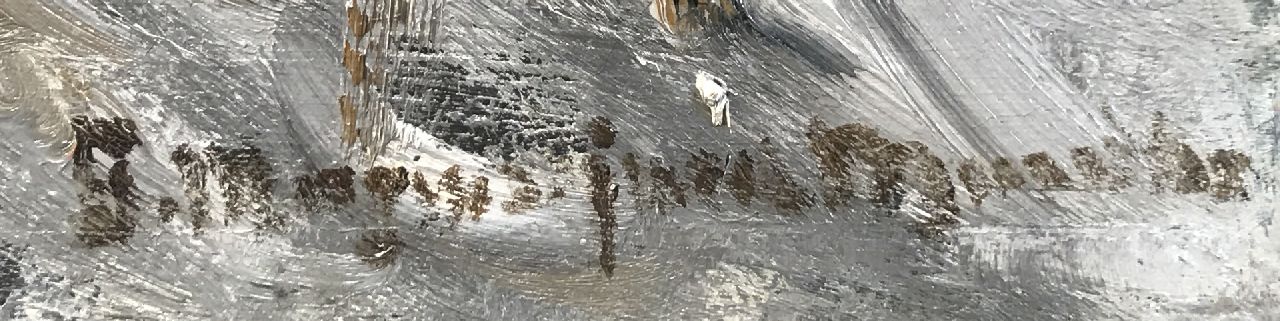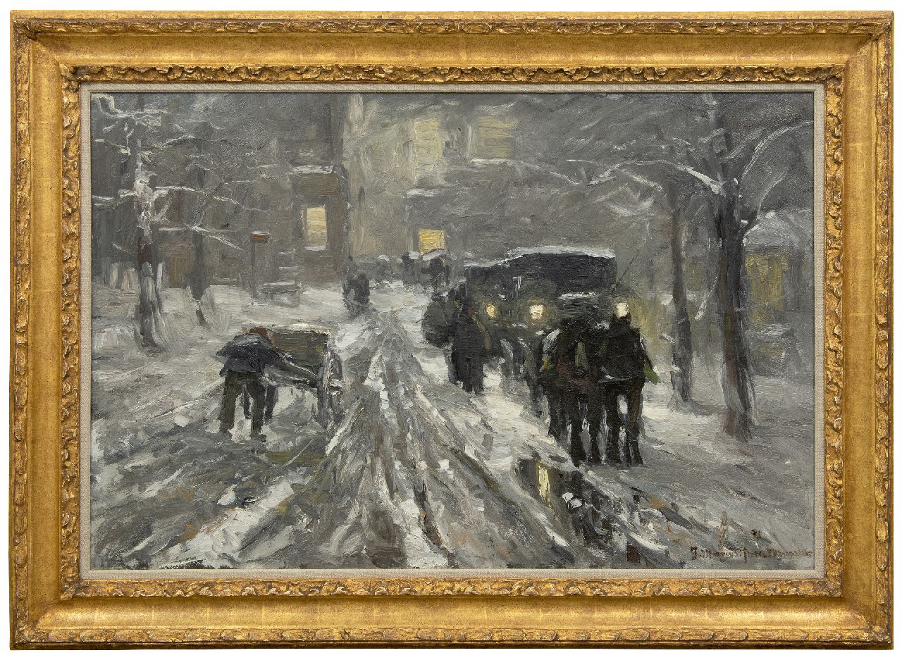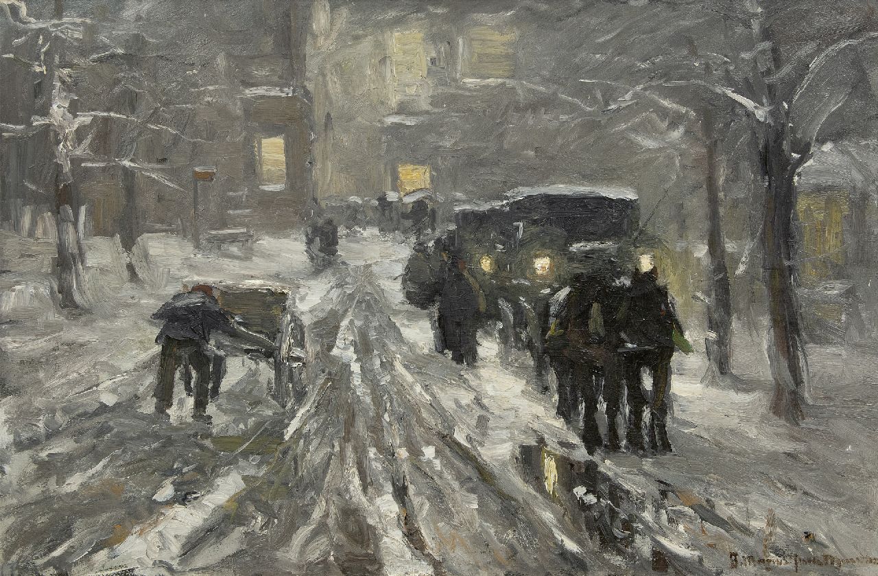 Morgenstjerne Munthe kunstwerk • schilderij • voorheen te koop Stadsgezicht met koetsen en paarden in de sneeuw, bij avond