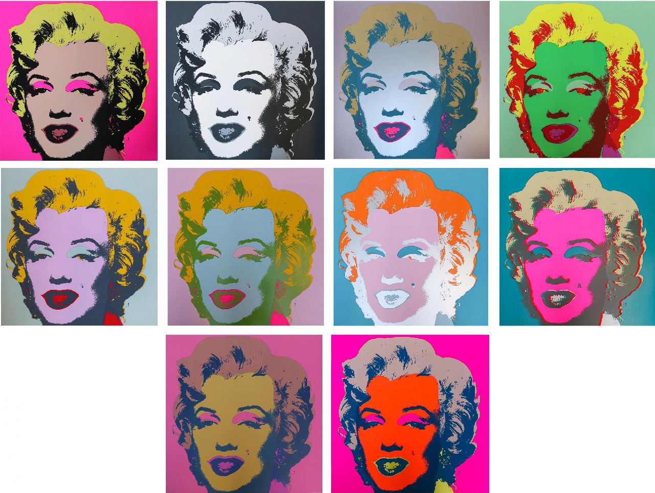 Andy Warhol begon aan de afbeeldingen van Marilyn Monroe te werken na haar tragische dood in 1967. Hij produceerde wat een van de meest iconische en gedenkwaardige voorstellingen van de actrice zou worden, en bijgevolg een van de meest gezochte gedrukte edities van zijn werk. Warhol creëerde een reeks van 10 variaties in wat nu de Marilyn Series wordt genoemd, elk met vrijwel dezelfde compositie, maar verschillende kleurvariaties. In 1970 werden deze originele zeefdrukken gereproduceerd om een nieuwe serie Marilyn zeefdrukken te maken in tien nieuwe kleurvariaties. Deze werden 'Sunday B Morning' prints genoemd. Deze afdrukken worden in Andy Warhol's catalogue raisonne erkend als authentieke reproducties, waarbij sommige door Warhol zelf zijn gesigneerd met de zin: 'this is not me. Andy Warhol.' In 1985 werd een derde serie geproduceerd met een gestempelde handtekening en deze werden bekend als de European Artist's Proof Editions. Het is onbekend hoeveel er van gemaakt zijn. Ze zijn aan de achterkant in blauwe inkt gestempeld en worden de 'Blue Ink' series genoemd. De afmetingen zijn 91,5 x 91,5 cm en ze zijn gedrukt op museumkarton met archiefinkten van hoge kwaliteit, net zoals de originelen. Deze Sunday B Morning prints zijn geproduceerd met dezelfde kwaliteit en integriteit als Warhol's originele Marilyn zeefdrukken. Het enige significante verschil is de kostprijs, wat betekent dat iedereen kan genieten van een Warhol zonder te diep in de buidel te moeten tasten.