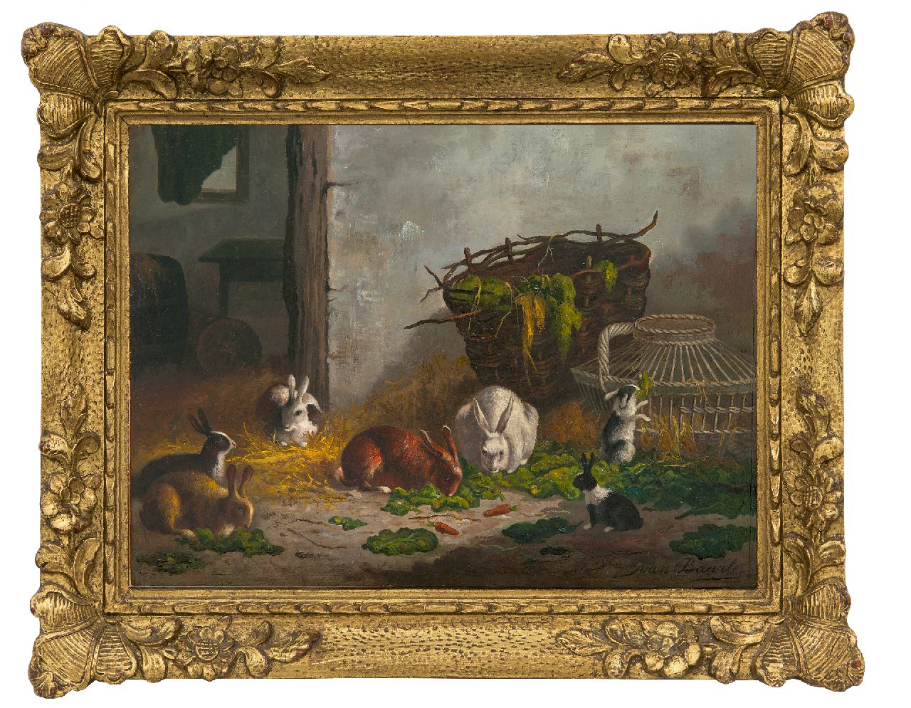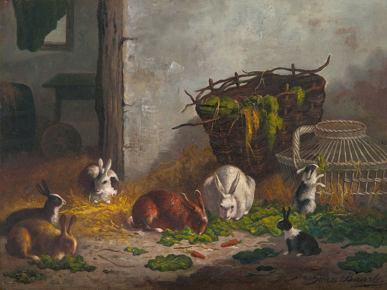 Nico van Baarle kunstwerk • schilderij • voorheen te koop Voedertijd in de konijnenstal