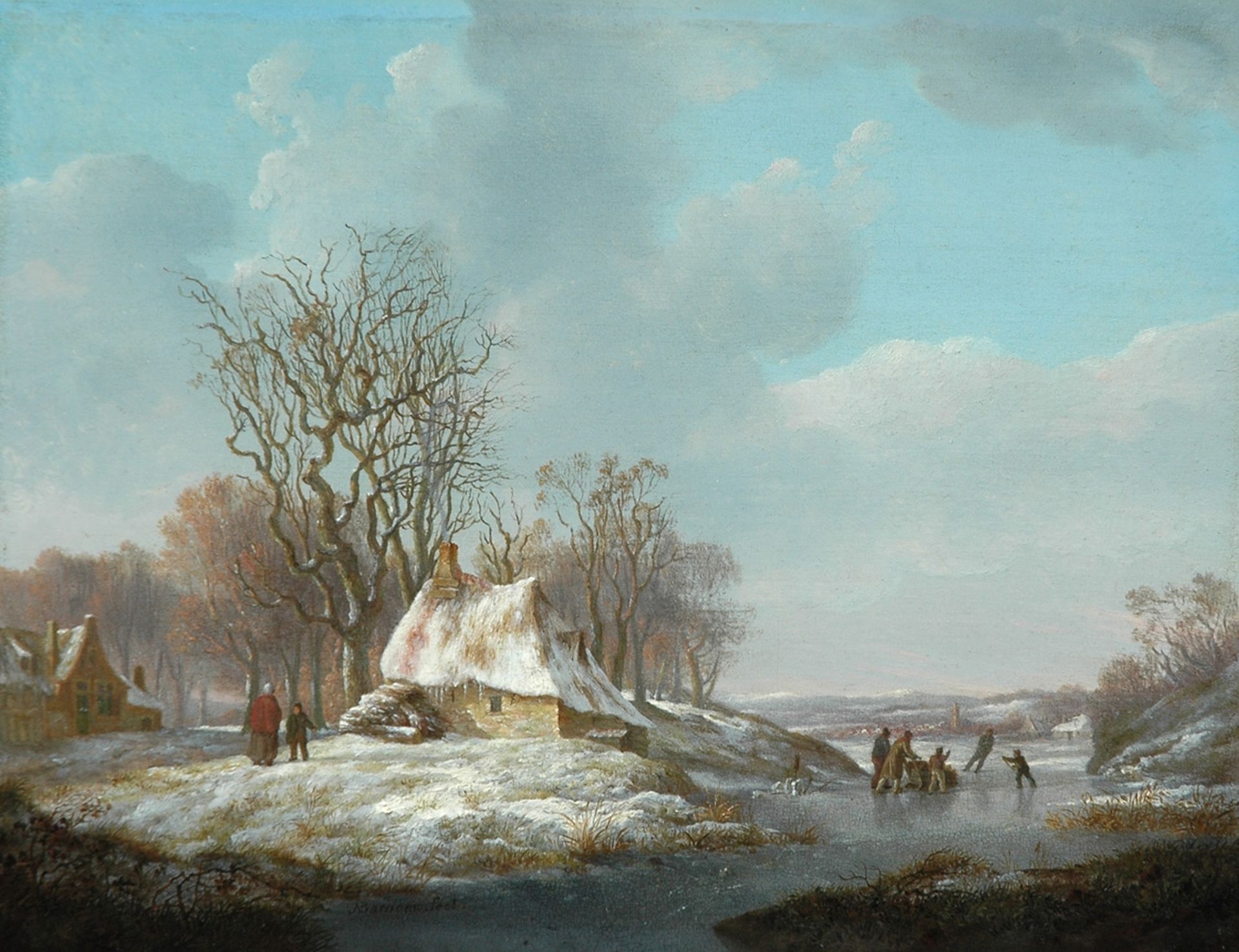 Nicolaas Barnouw kunstwerk • schilderij • voorheen te koop Winterlandschap met boerenhoeves en schaatsers