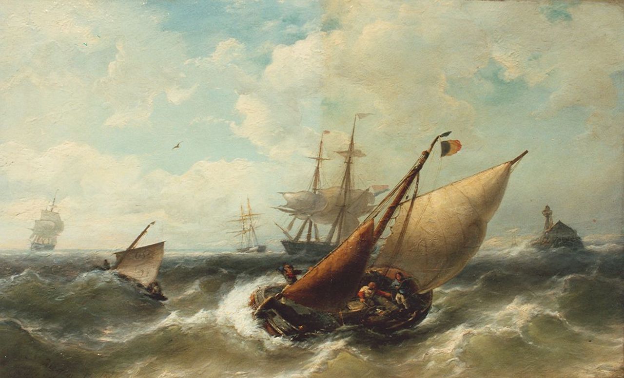 Nicolaas Riegen kunstwerk • schilderij • voorheen te koop Boten op woelige zee