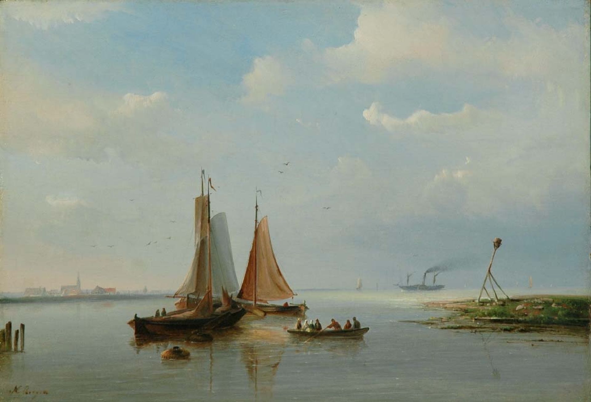 Nicolaas Riegen kunstwerk • schilderij • voorheen te koop Drie botters voor anker bij een havenmond