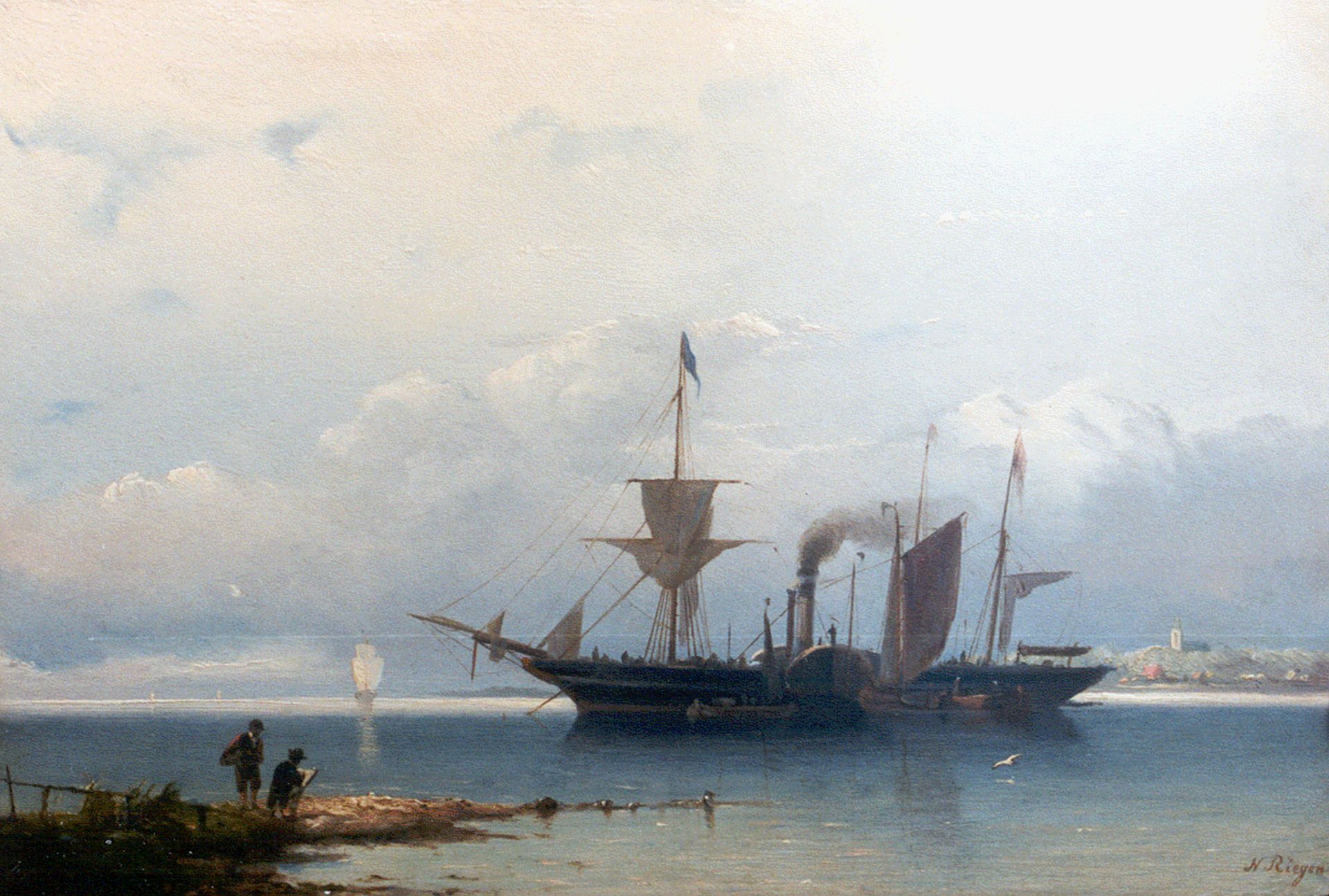 Nicolaas Riegen kunstwerk • schilderij • voorheen te koop Havenmonding met raderboot, en kunstenaar aan de oever