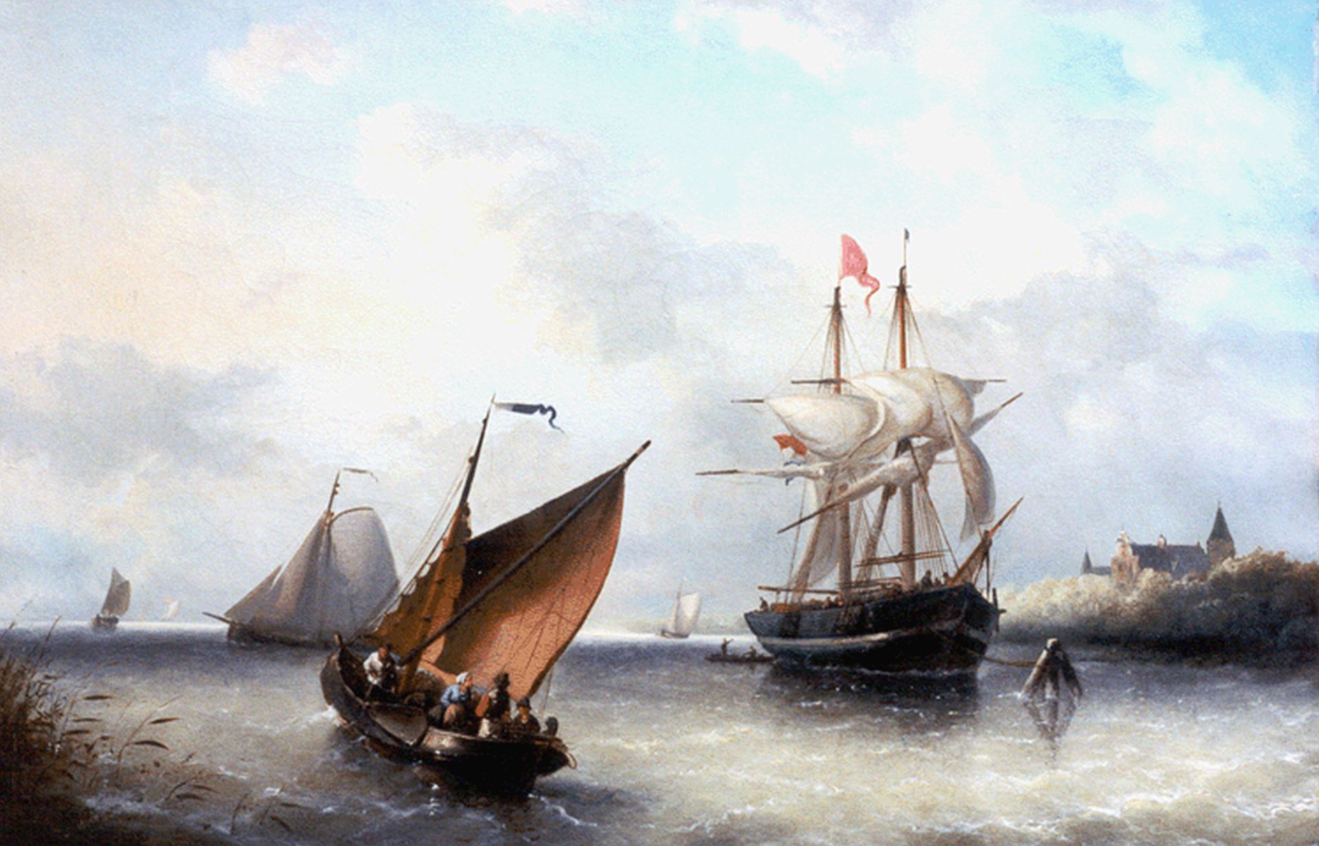 Nicolaas Riegen kunstwerk • schilderij • voorheen te koop Schepen in een riviermonding