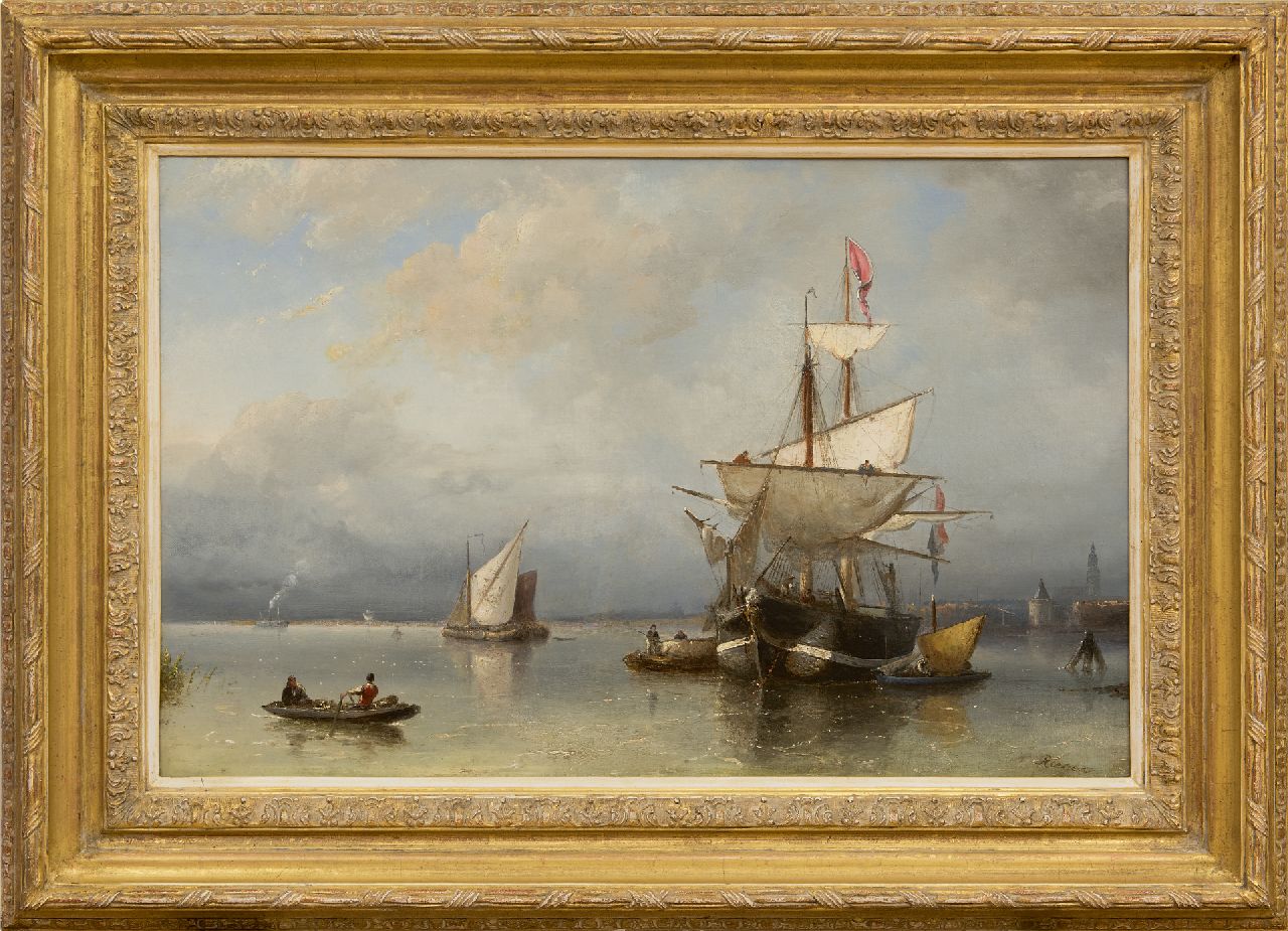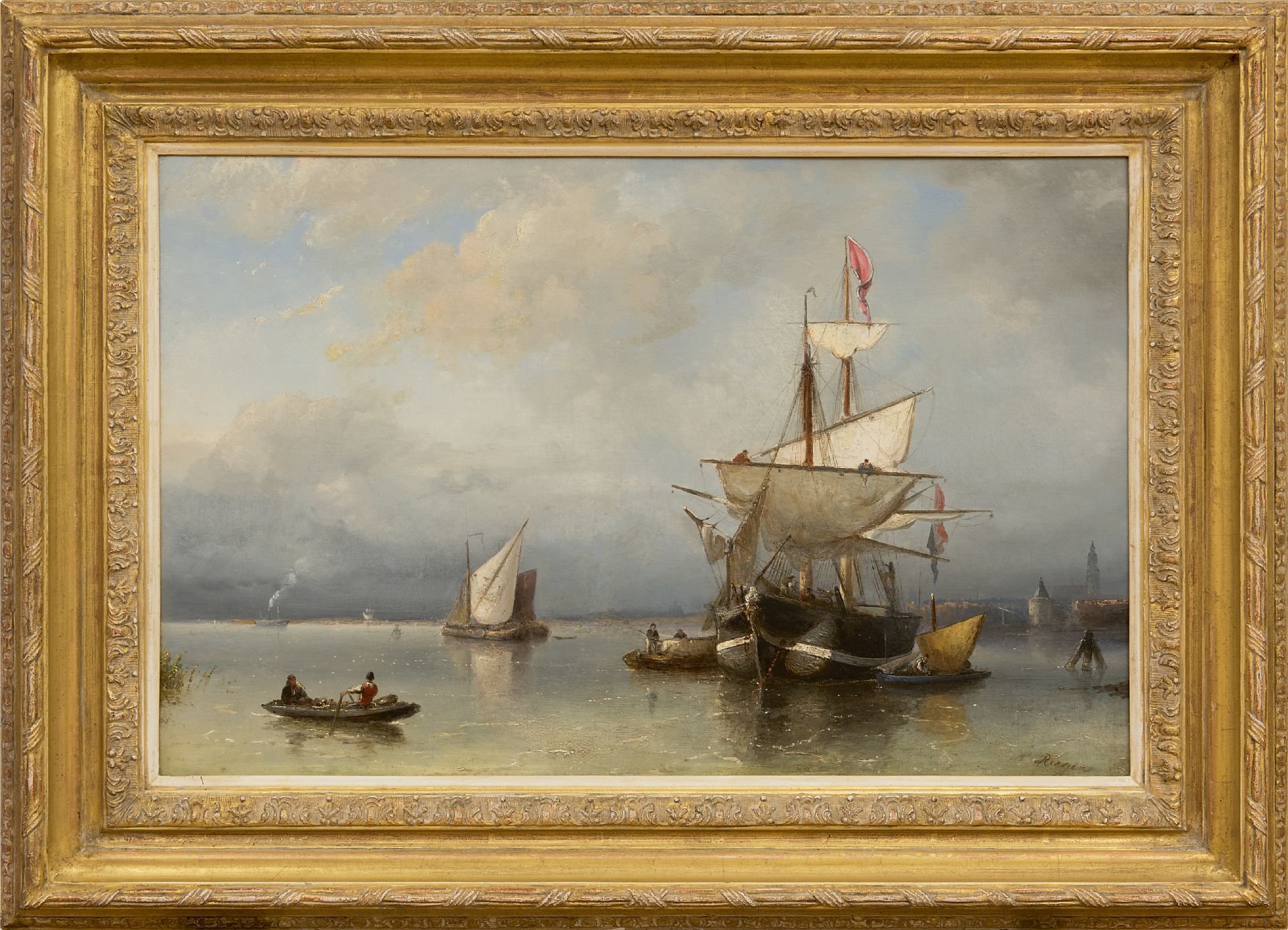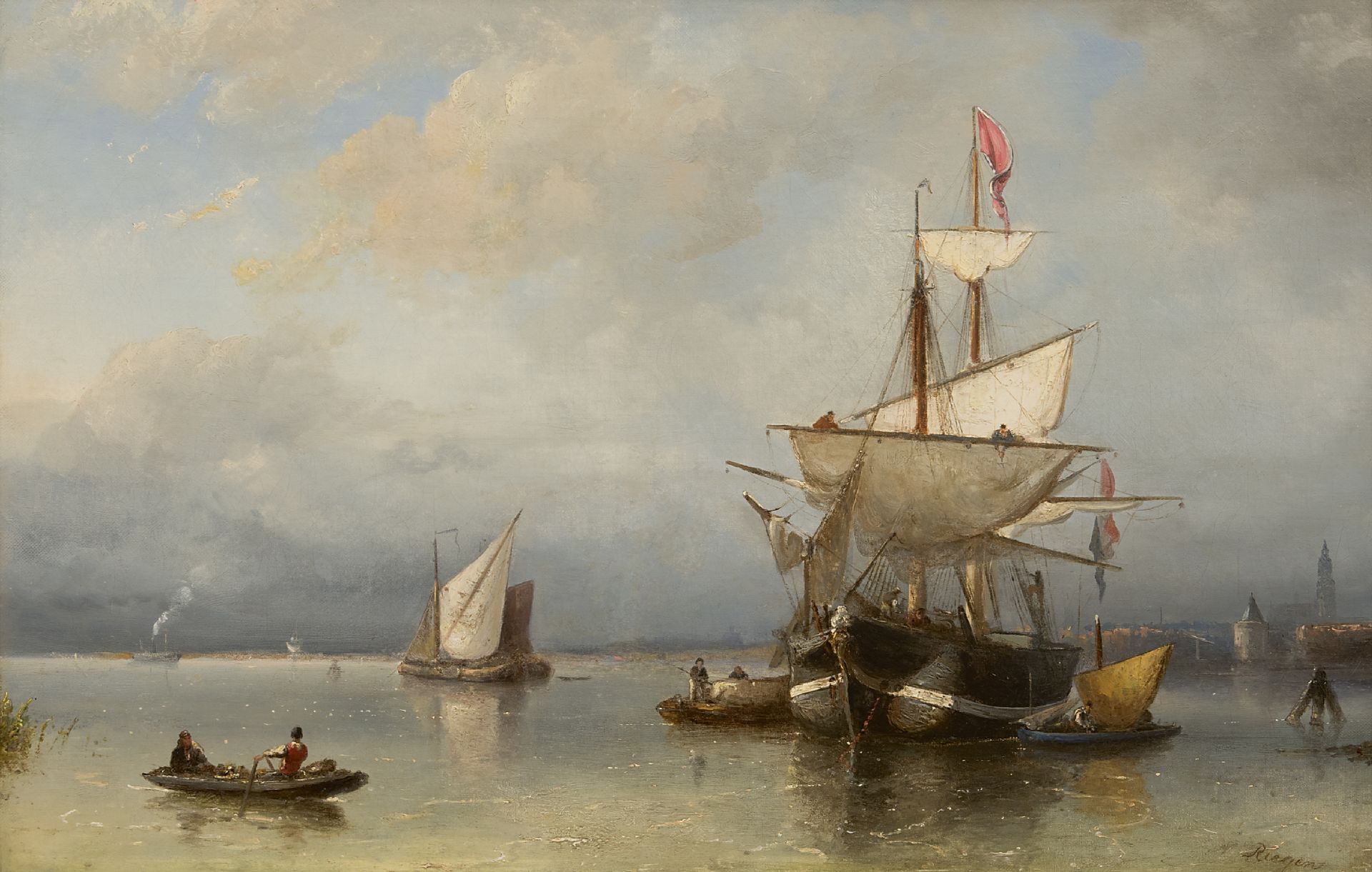 Nicolaas Riegen kunstwerk • schilderij • voorheen te koop Schepen voor anker op het IJ voor Amsterdam