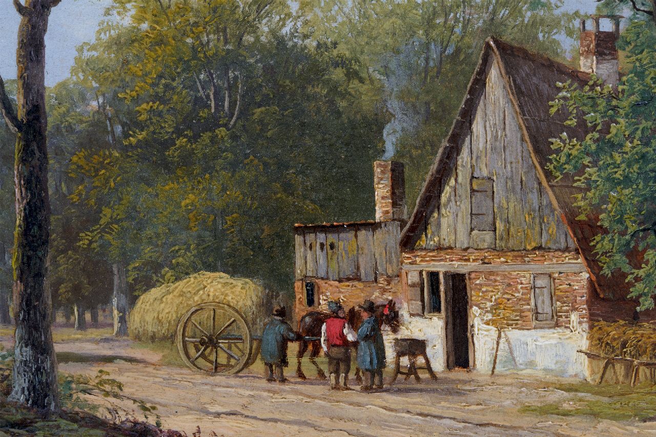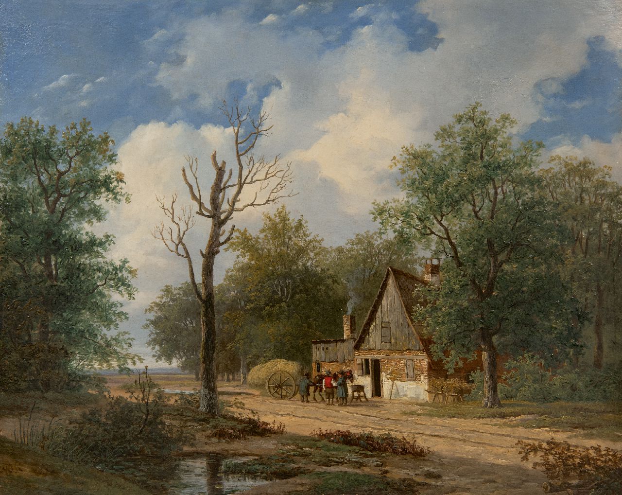 Nicolaas Roosenboom kunstwerk • schilderij • te koop Boslandschap met figuren bij een hooikar