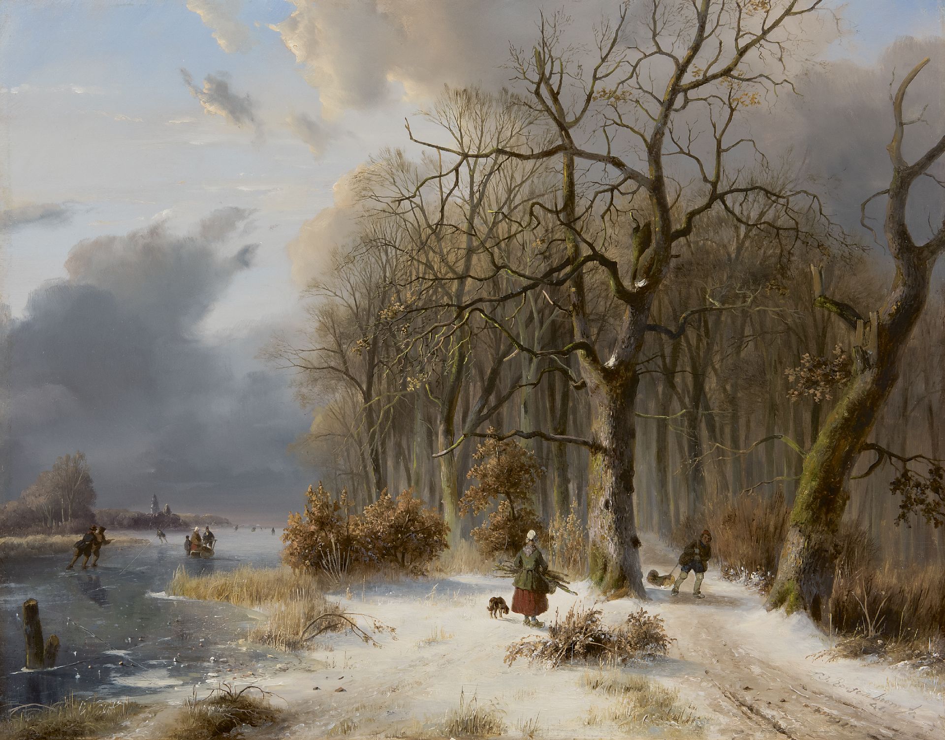Nicolaas Roosenboom kunstwerk • schilderij • voorheen te koop Houtsprokkelaars en schaatsers in een winters landschap
