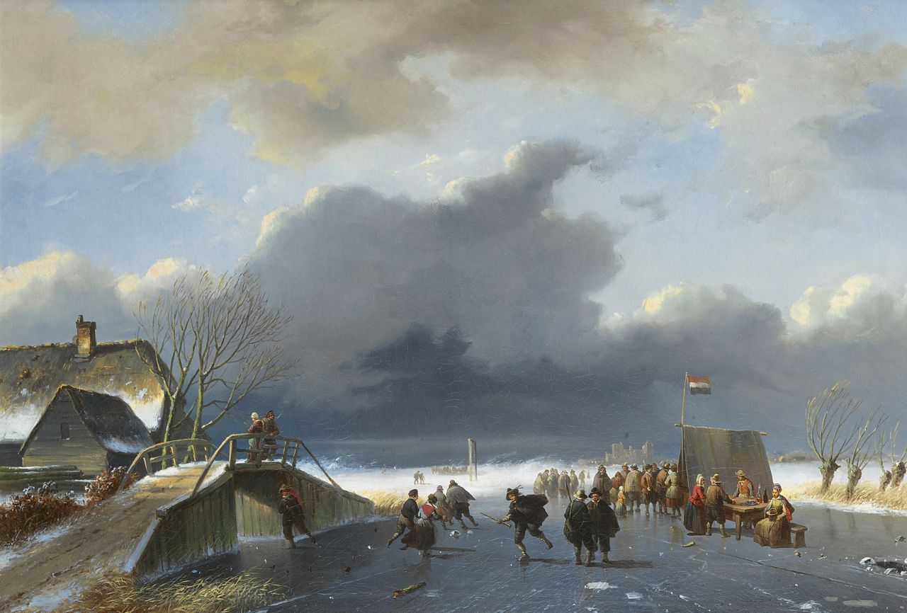 Nicolaas Roosenboom kunstwerk • schilderij • voorheen te koop IJspret bij een koek-en-zopie (stoffage: H.A. Schaep Mechelen 1826-1870 Antwerpen)