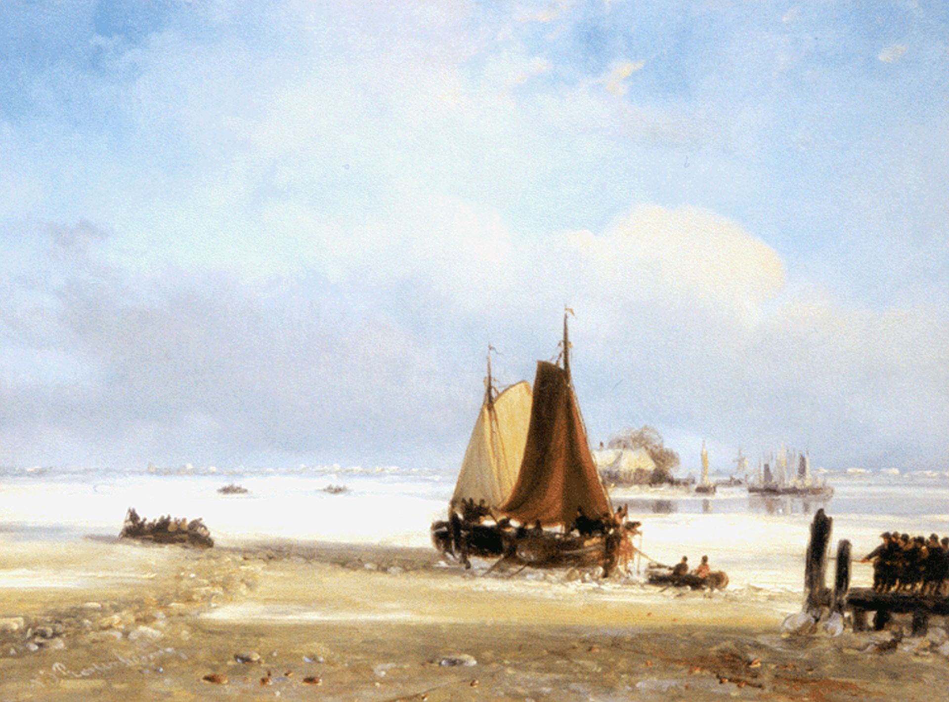 Nicolaas Roosenboom kunstwerk • schilderij • voorheen te koop Scheepsverkeer op een bevroren rivierarm