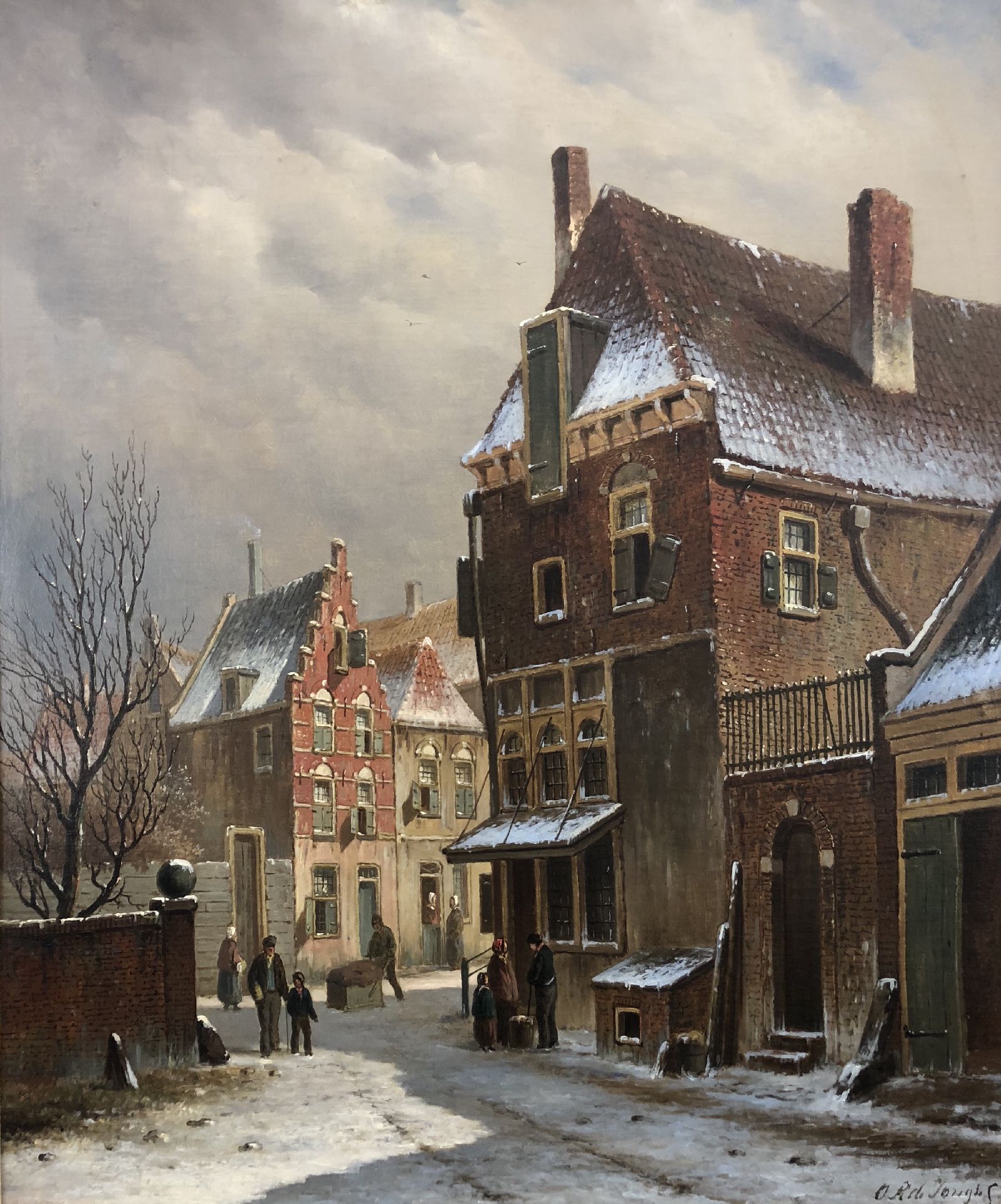 Oene Romkes de Jongh kunstwerk • schilderij • voorheen te koop Besneeuwd stadsgezicht