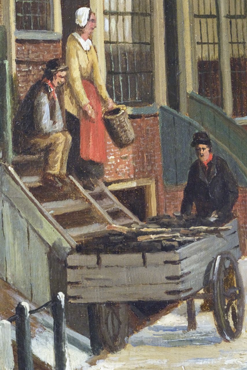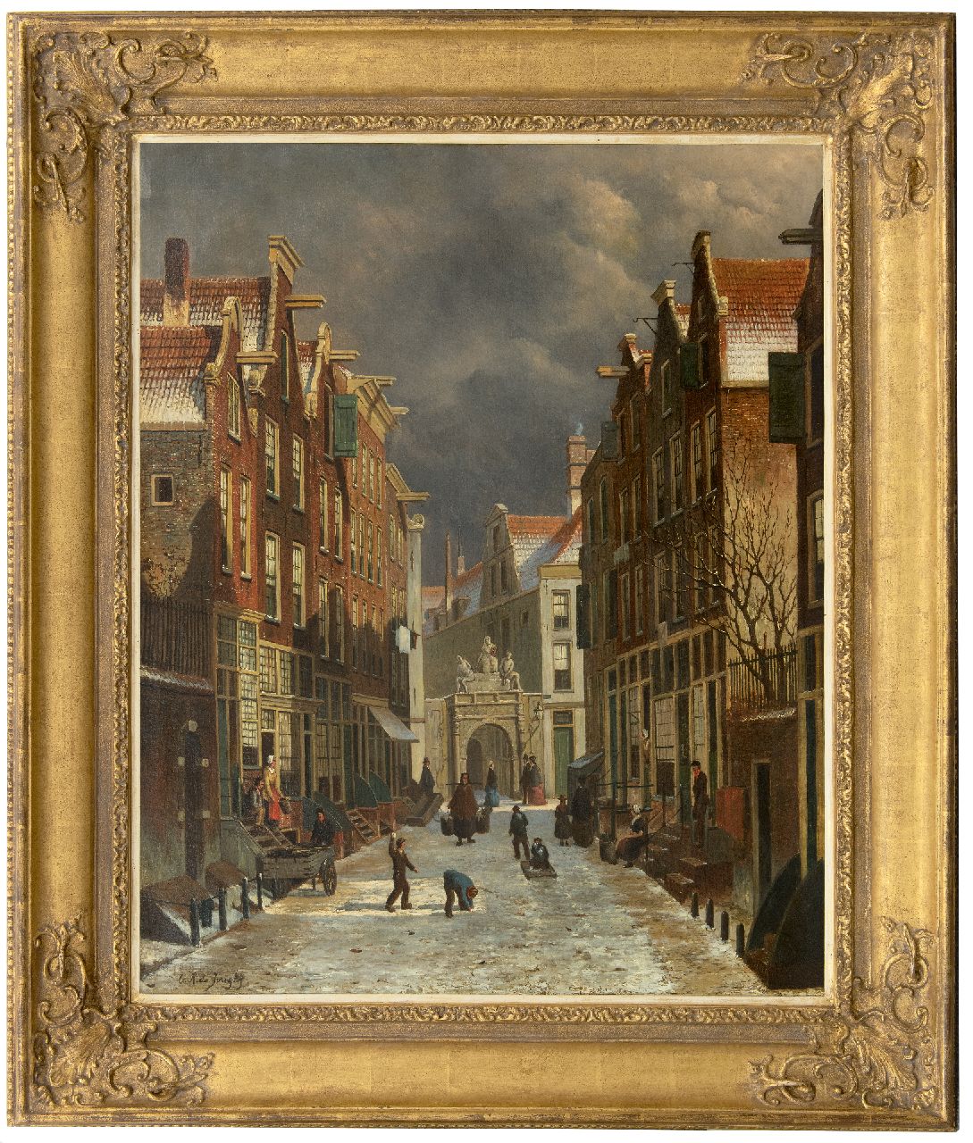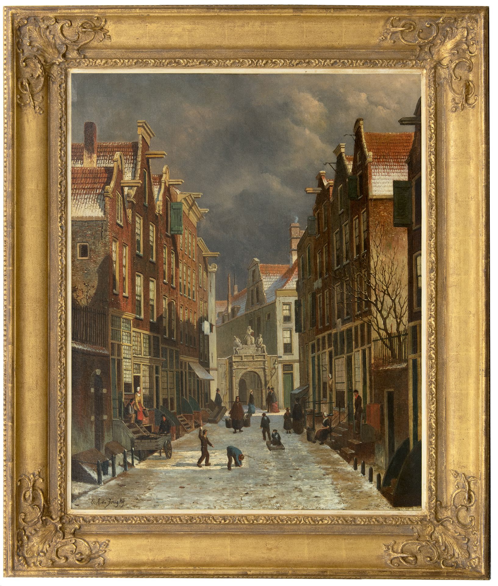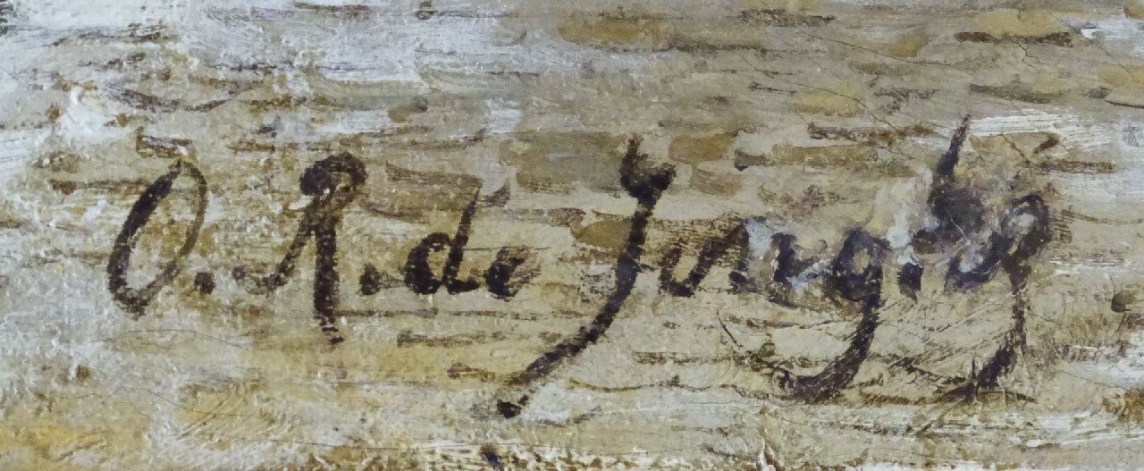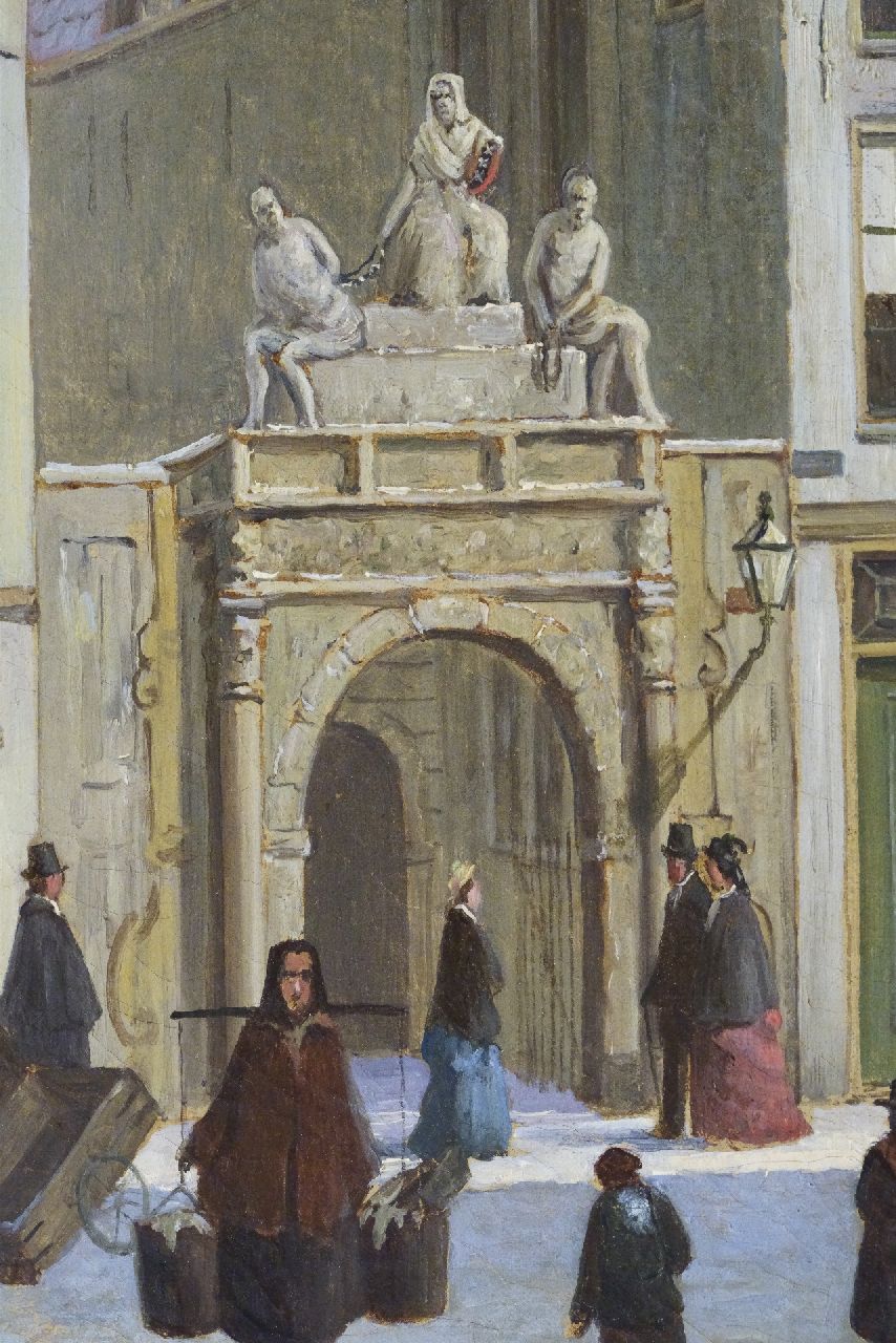 De stadsgezichten van Oene Romkes de Jongh vertonen alle kenmerken van het romantische Hollandse stadsgezicht zoals dat in de 19e eeuw in Amsterdam vorm kreeg: de nauwkeurige uitwerking, de levendige stoffering en de aandacht voor oude, Hollandse architectuur. Van de schilder zelf is niet veel bekend. Hij werd in 1812 in Makkum geboren en woonde en werkte vermoedelijk het grootste deel van zijn leven in Amsterdam. Daar werd hij vooral geïnspireerd door het werk van tijdgenoot Cornelis Springer en diens leerling Adrianus Eversen. Het oeuvre van de schilder omvat sfeervolle stadsgezichten bij zomer en winter, onder andere van Amsterdam en de Zuiderzeehavens, en enkele landschappen.