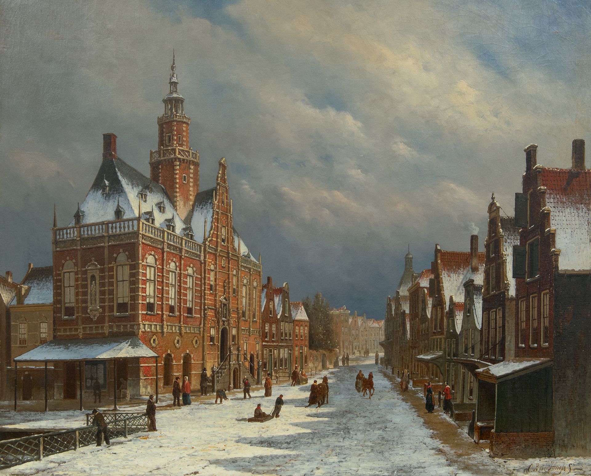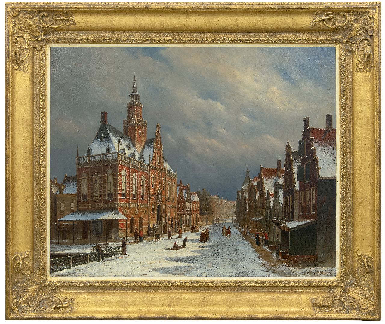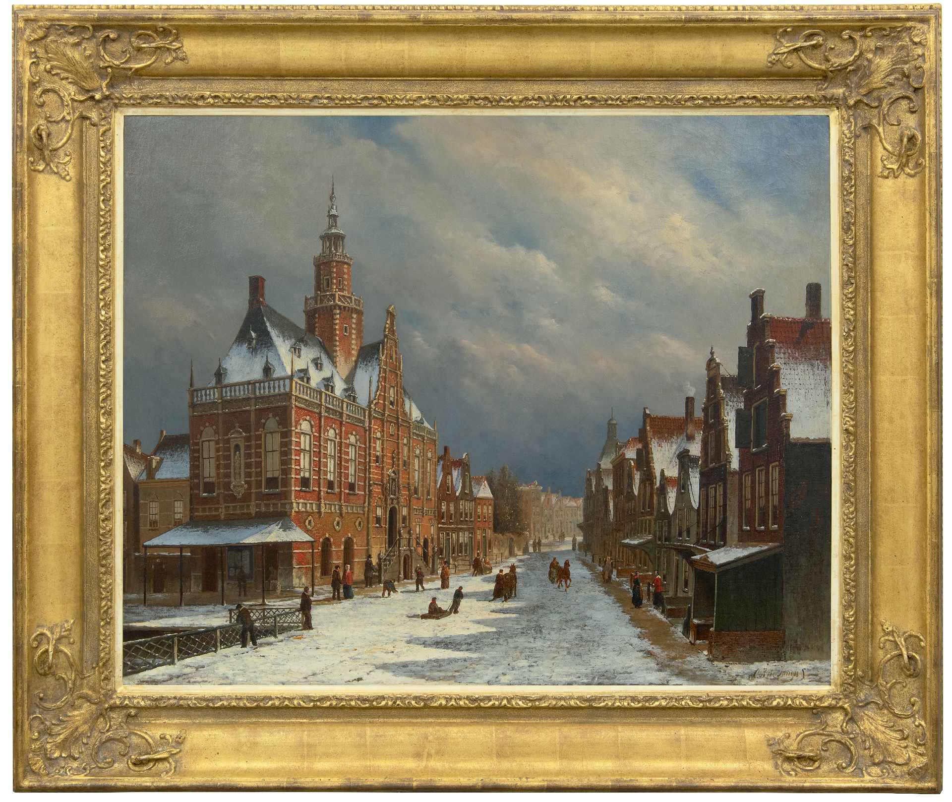 Oene Romkes de Jongh kunstwerk • schilderij • voorheen te koop Het stadhuis van Bolsward in de sneeuw