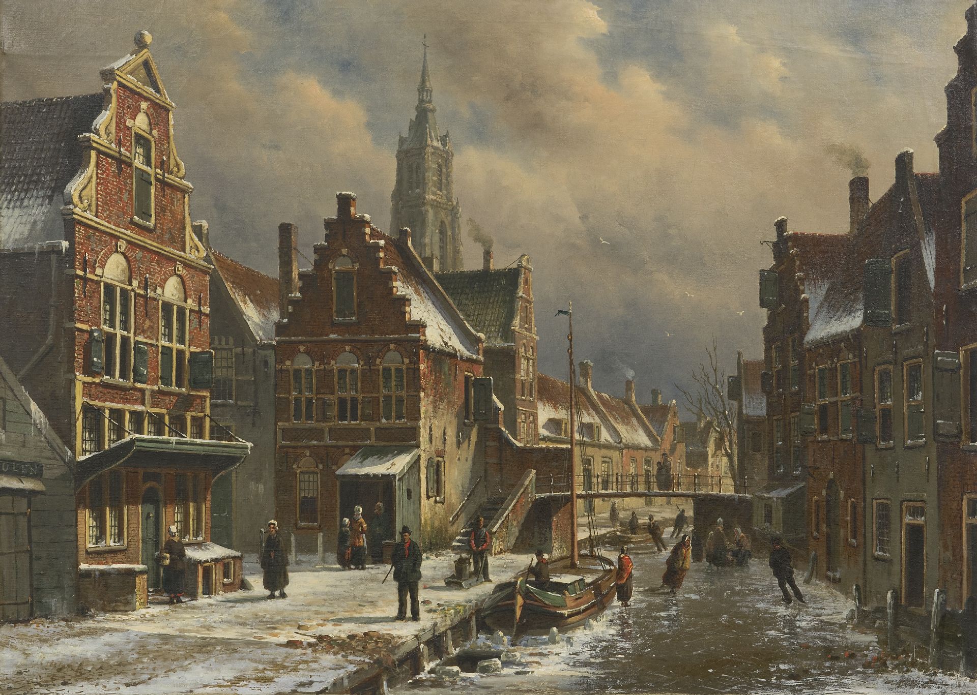Oene Romkes de Jongh kunstwerk • schilderij • voorheen te koop Winters stadsgezicht met schaatsers
