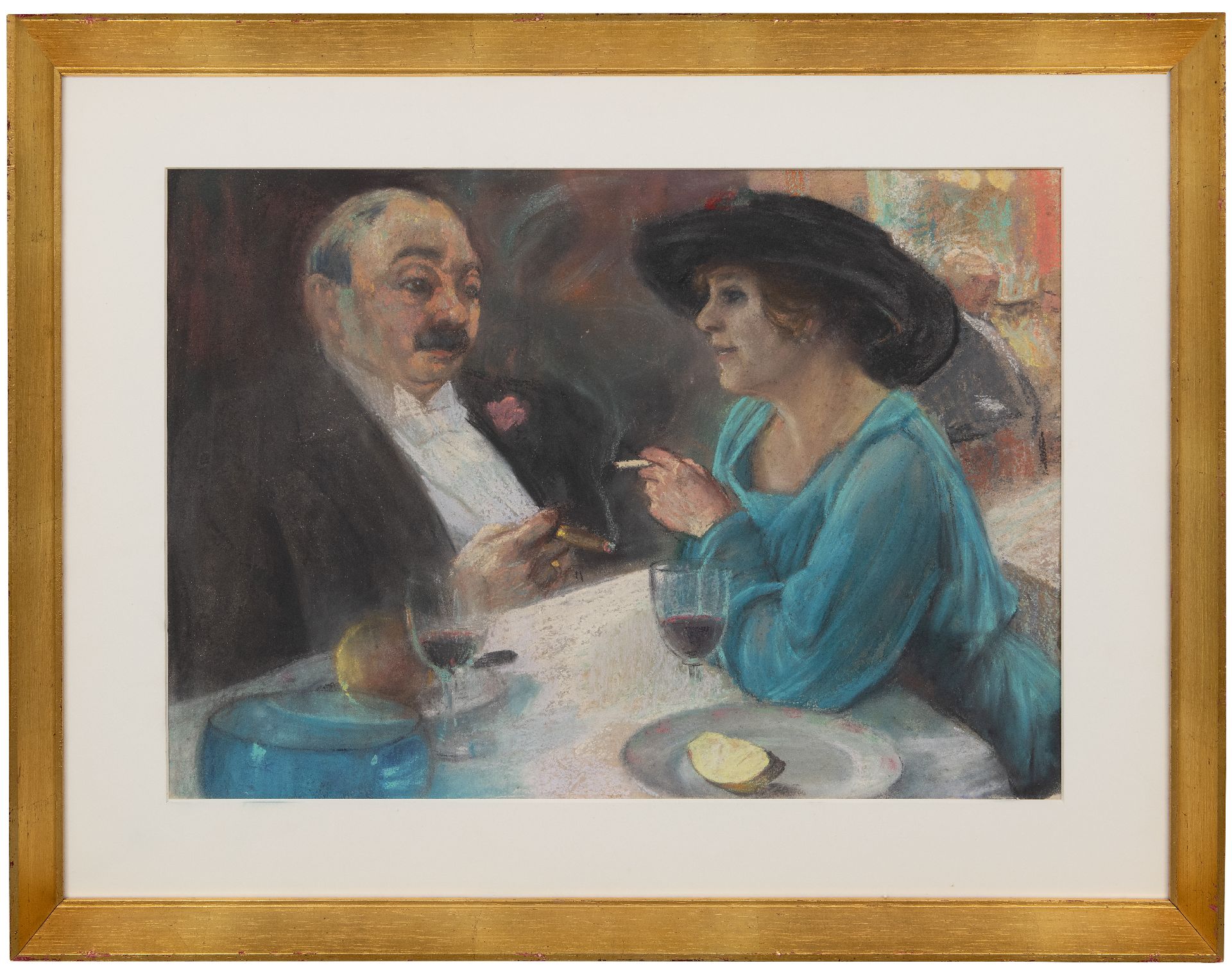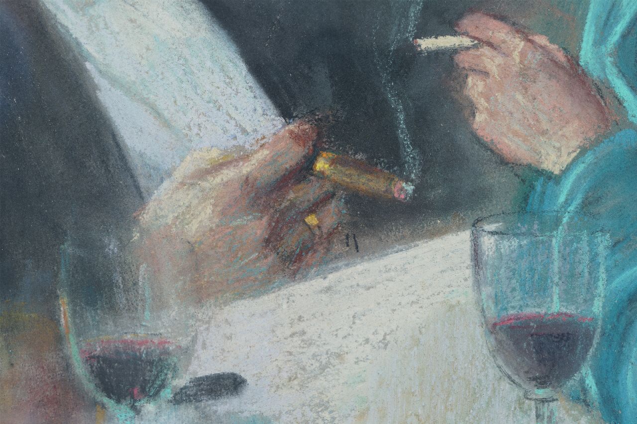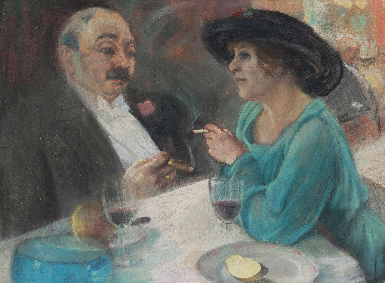 Onbekend kunstwerk • aquarel • tekening • te koop Man en vrouw in een café