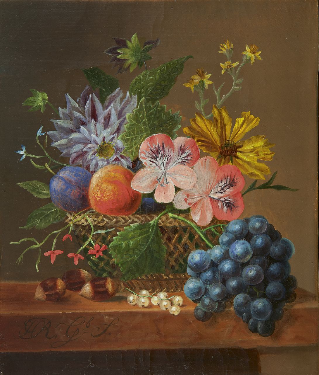 Onbekend kunstwerk • schilderij • te koop Stilleven met bloemen en fruit in een mand