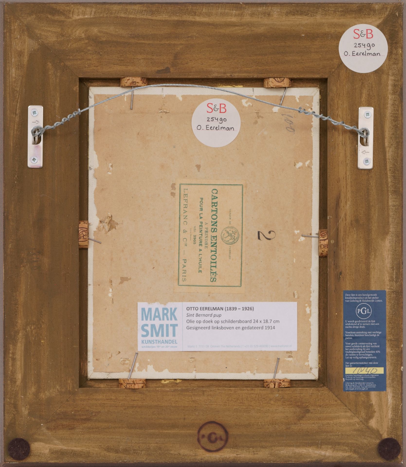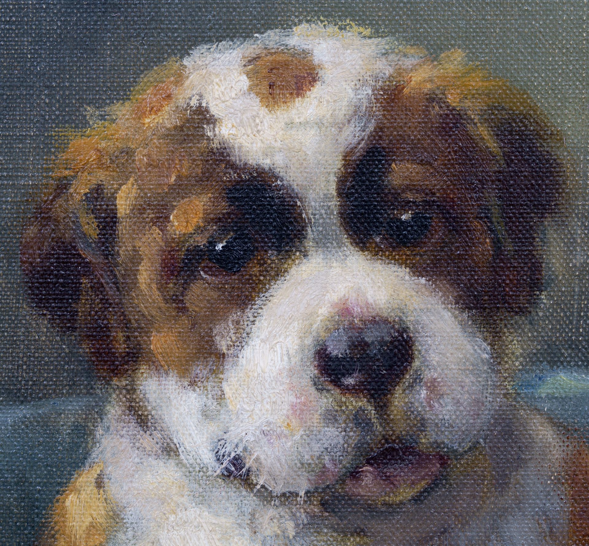 Otto Eerelman kunstwerk • schilderij • te koop Sint-Bernard pup in z'n mandje