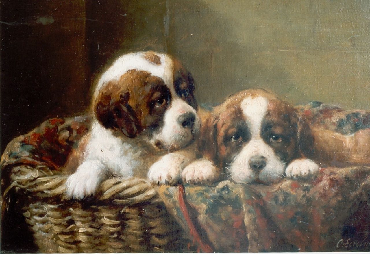 Otto Eerelman kunstwerk • schilderij • voorheen te koop Twee St. Bernhard puppies in een mand