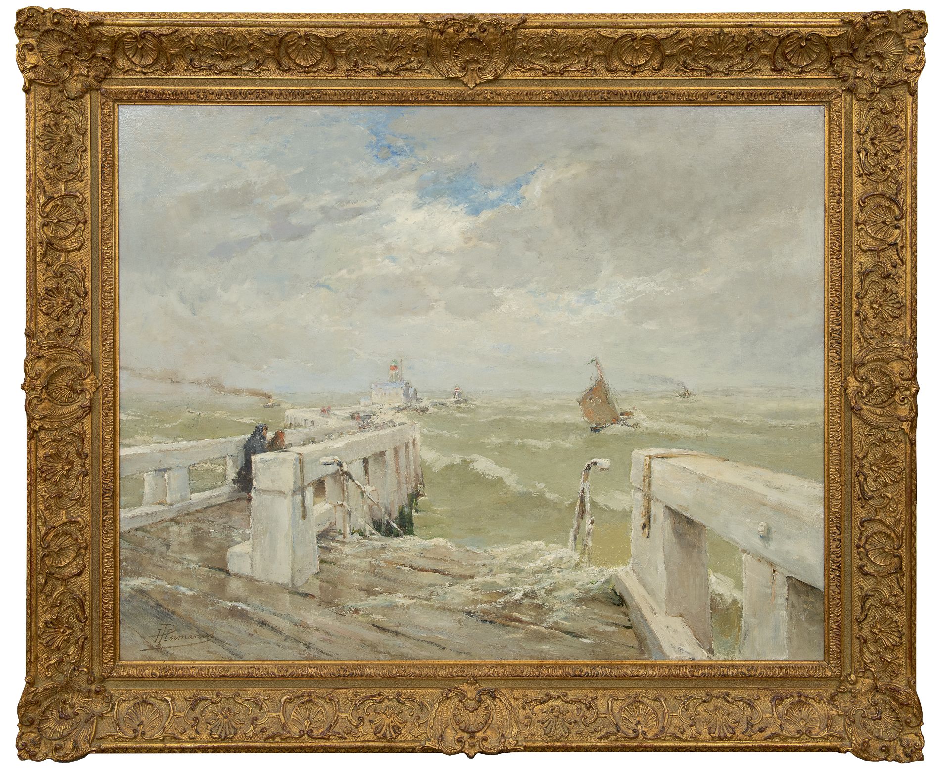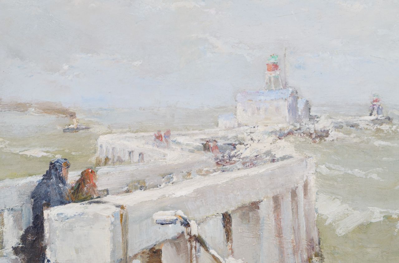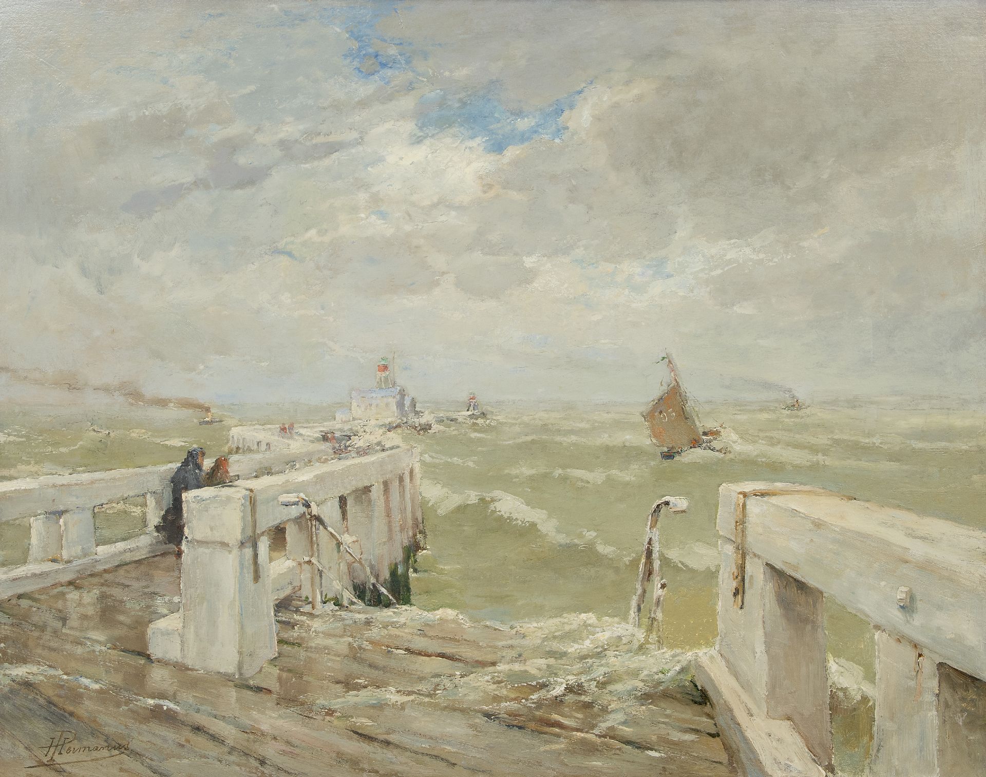 Paul Hermanus kunstwerk • schilderij • voorheen te koop Figuren op een pier bij een vuurtoren in woelige branding