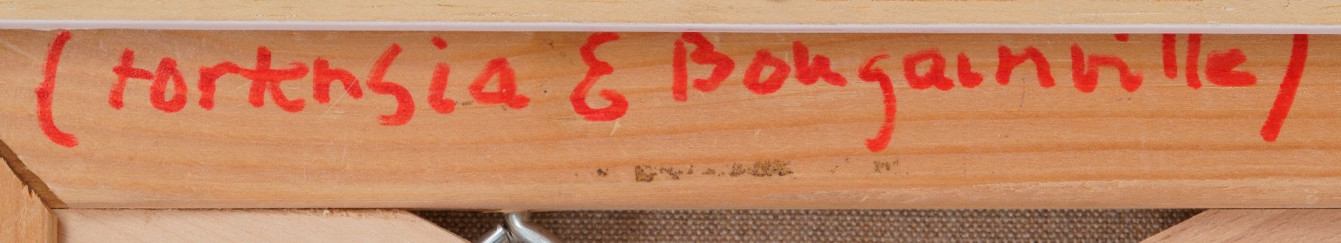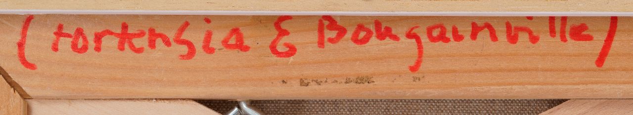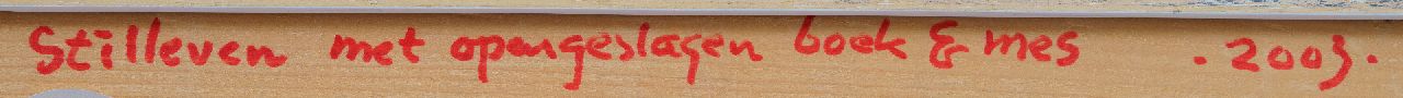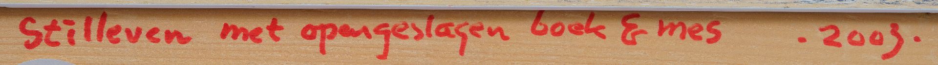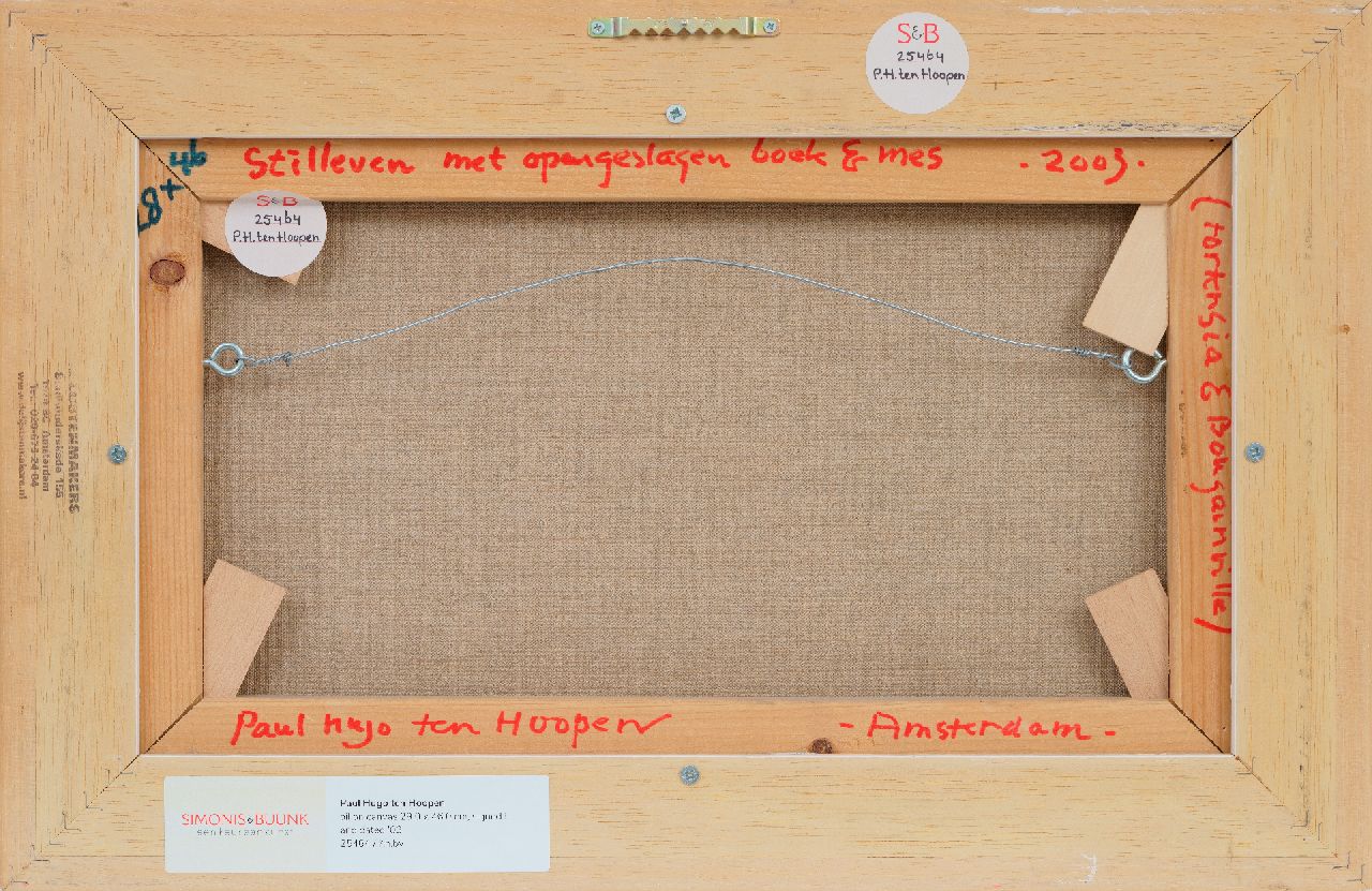 annotatie op spieraam: 'Paul Hugo ten Hoopen, Stilleven met opengeslagen boek & mes - 2003, (hortensia & bougainville)'
