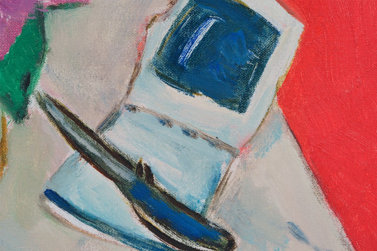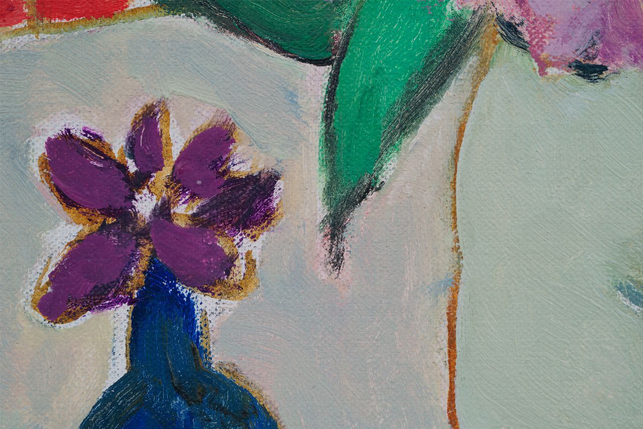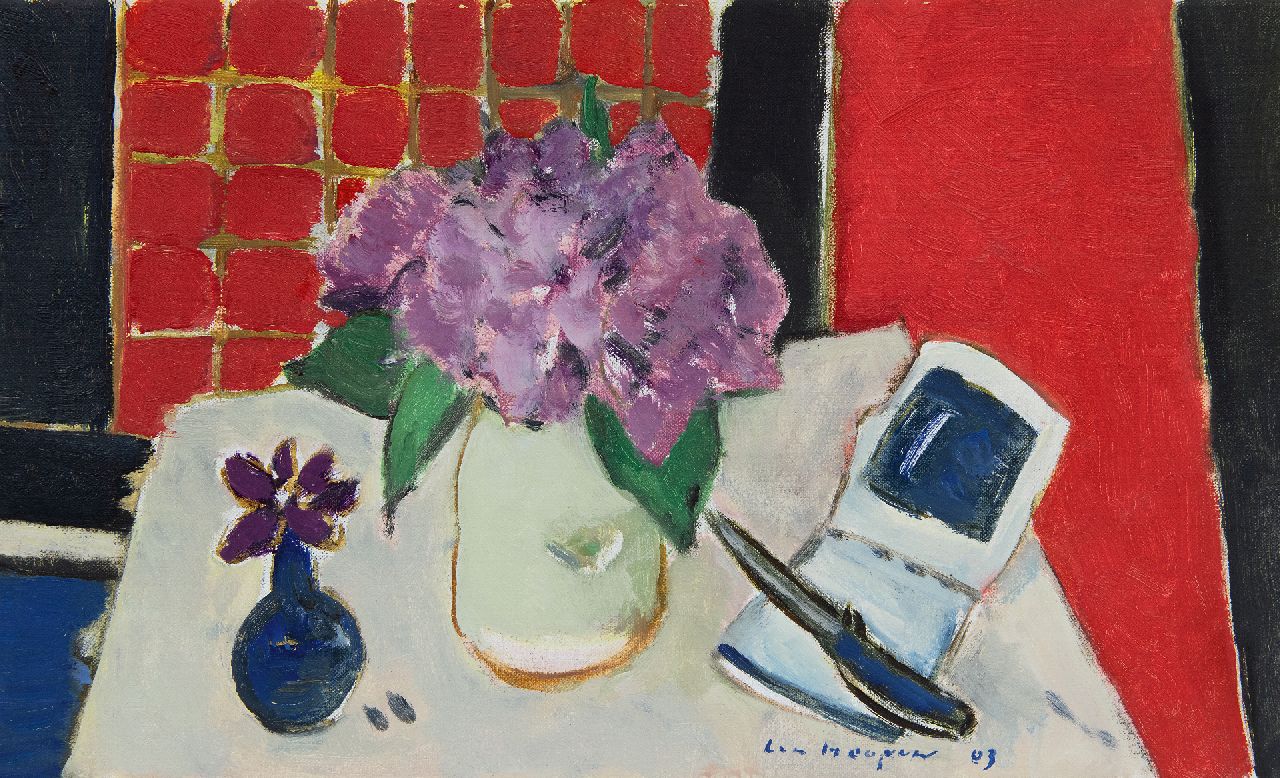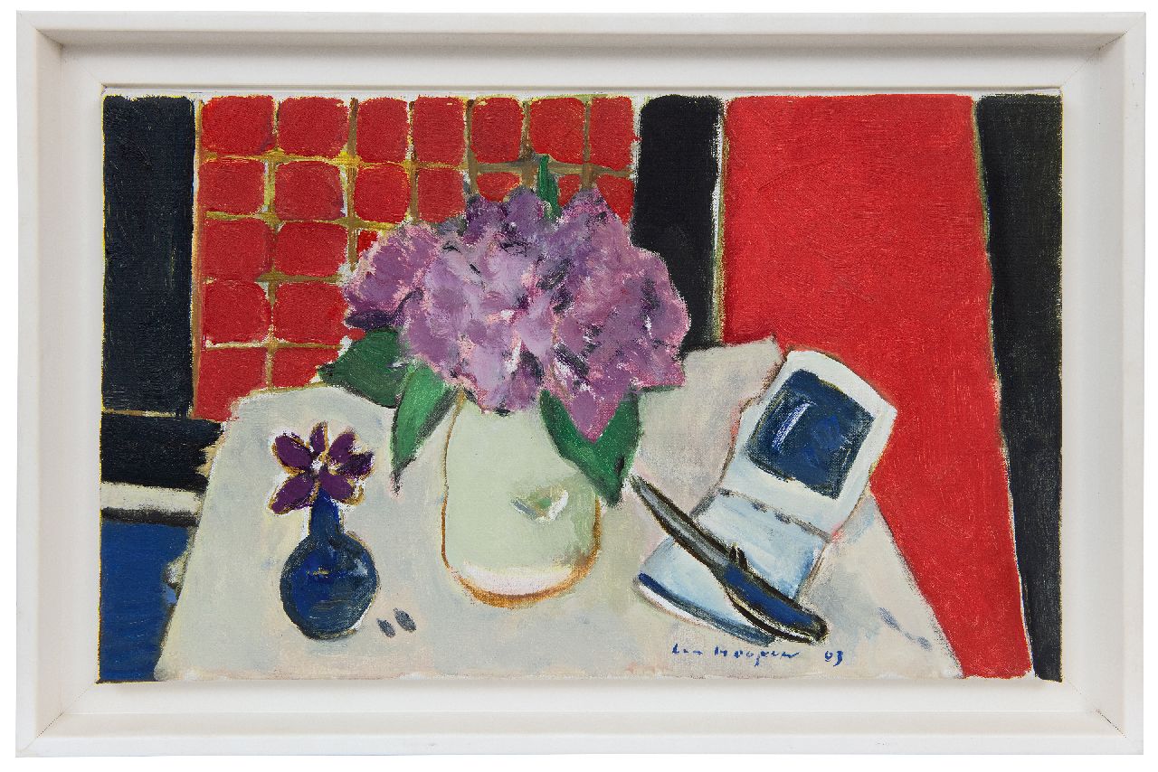 Paul Hugo Hoopen kunstwerk • schilderij • voorheen te koop Stilleven met opengeslagen boek en mes (hortensia & bougainville)