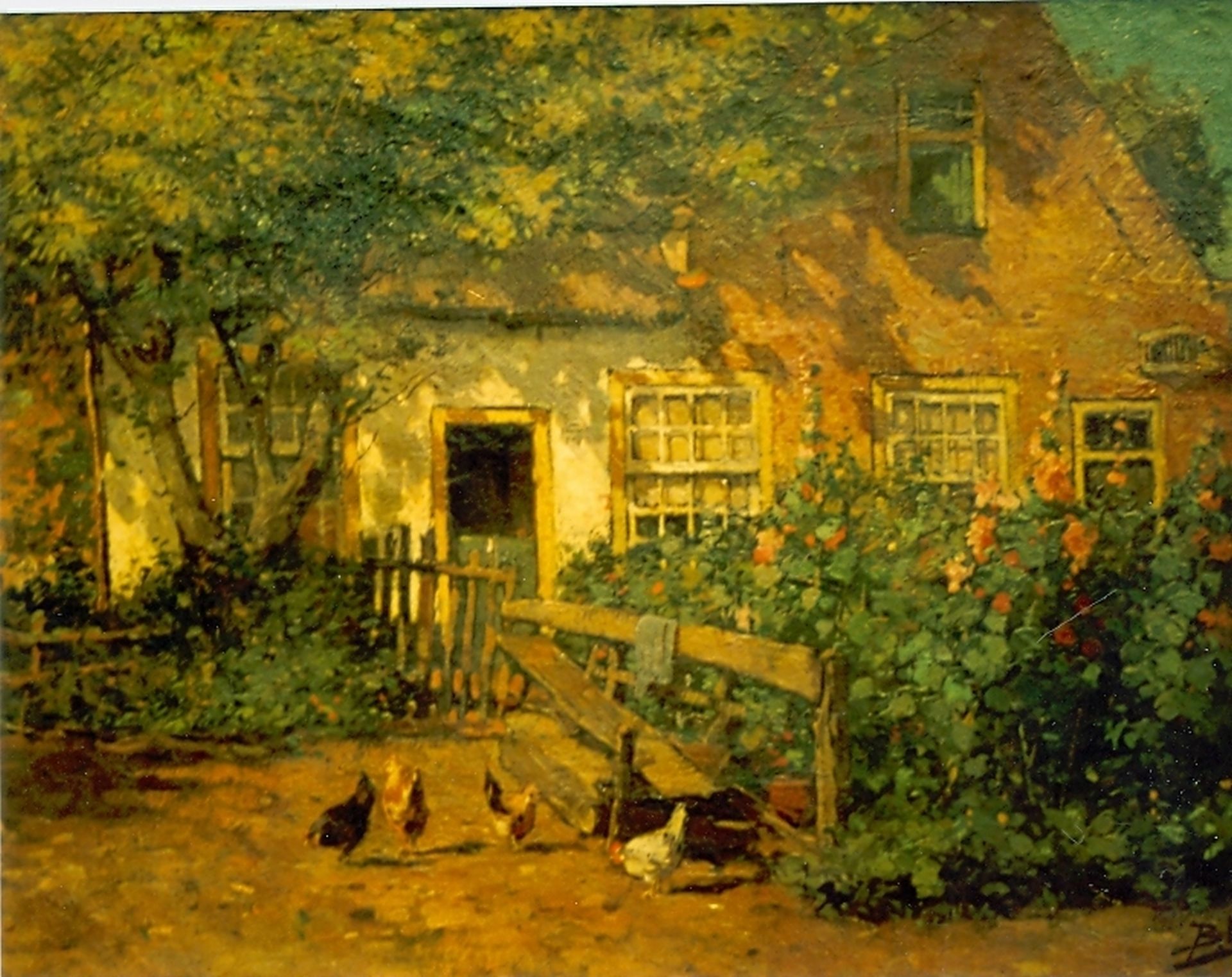Paul van der Ven kunstwerk • schilderij • voorheen te koop Veldje met goudsbloemen voor een boerderij