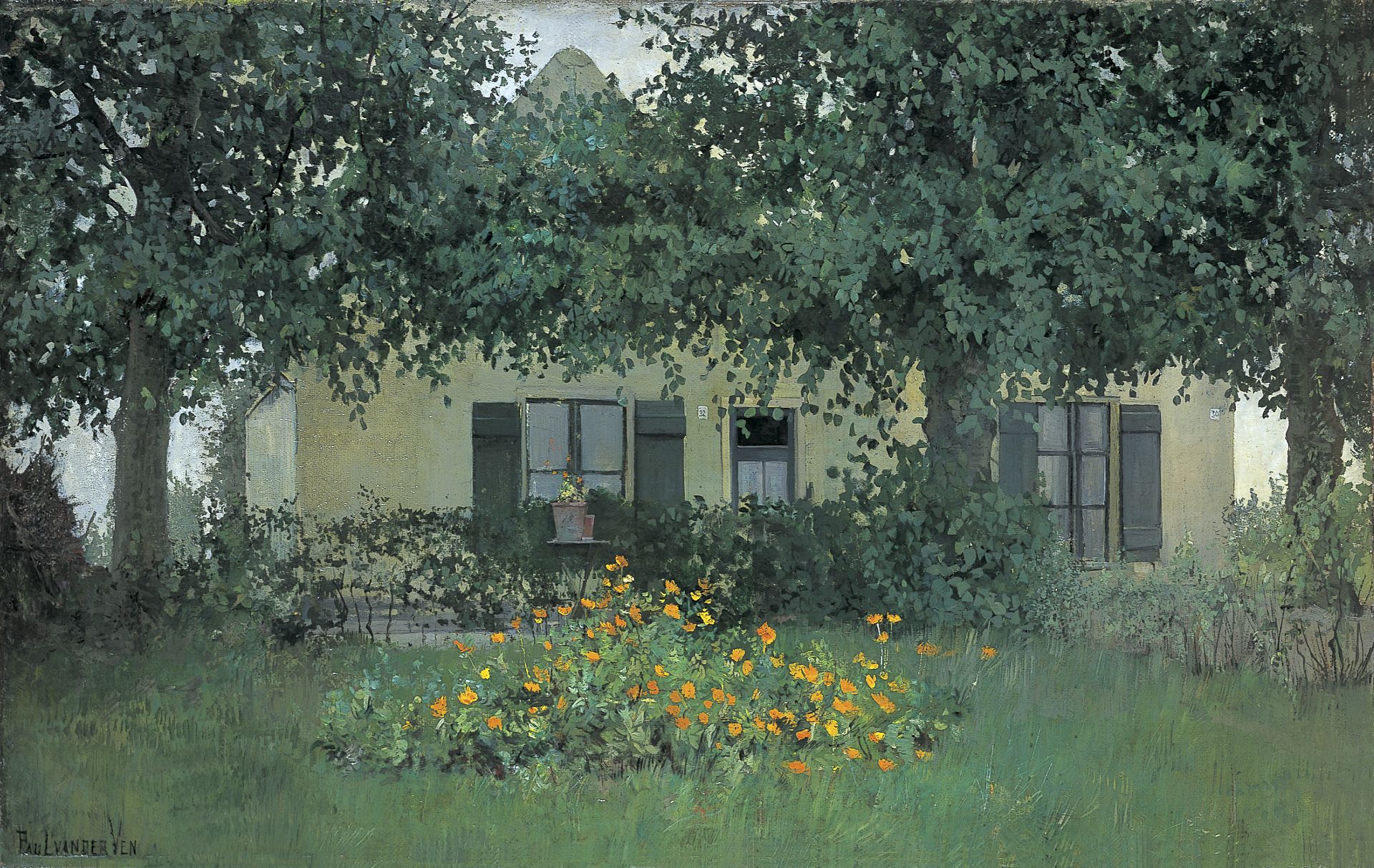 Paul van der Ven kunstwerk • schilderij • voorheen te koop Veldje met goudsbloemen voor een boerderij