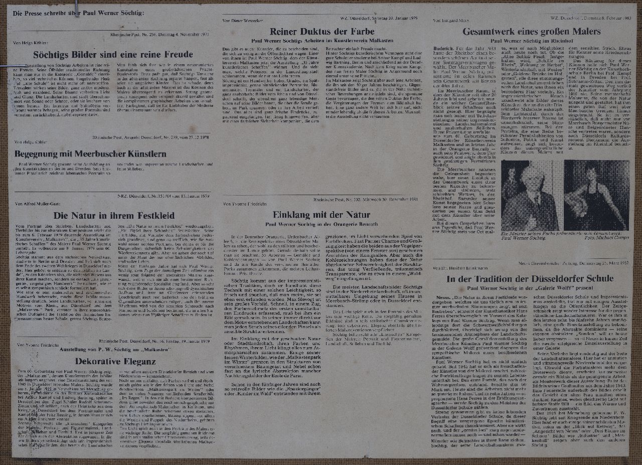 De in 1919 geboren Paul Werner Söchtig behoort tot de Duitse laat-impressionistische schilders, maar hij behandelt deze stijl met de frisheid en spontaniteit van de eerste beoefenaars. Hij schildert stadsgezichten van Düsseldorf, stillevens en interieurs met figuren en naakten in warme, behaaglijke kleuren. Het snel vastleggen van zijn eerste indrukken is voor hem belangrijk, vooral in zijn landschappen; de weiden en boomgroepen van de Niederrhein behoren daarbij tot zijn lievelingsmotieven. De schilder streeft in zijn werk naar harmonie en schoonheid, ook als hij midden jaren 50 korte tijd overgaat tot abstractie.