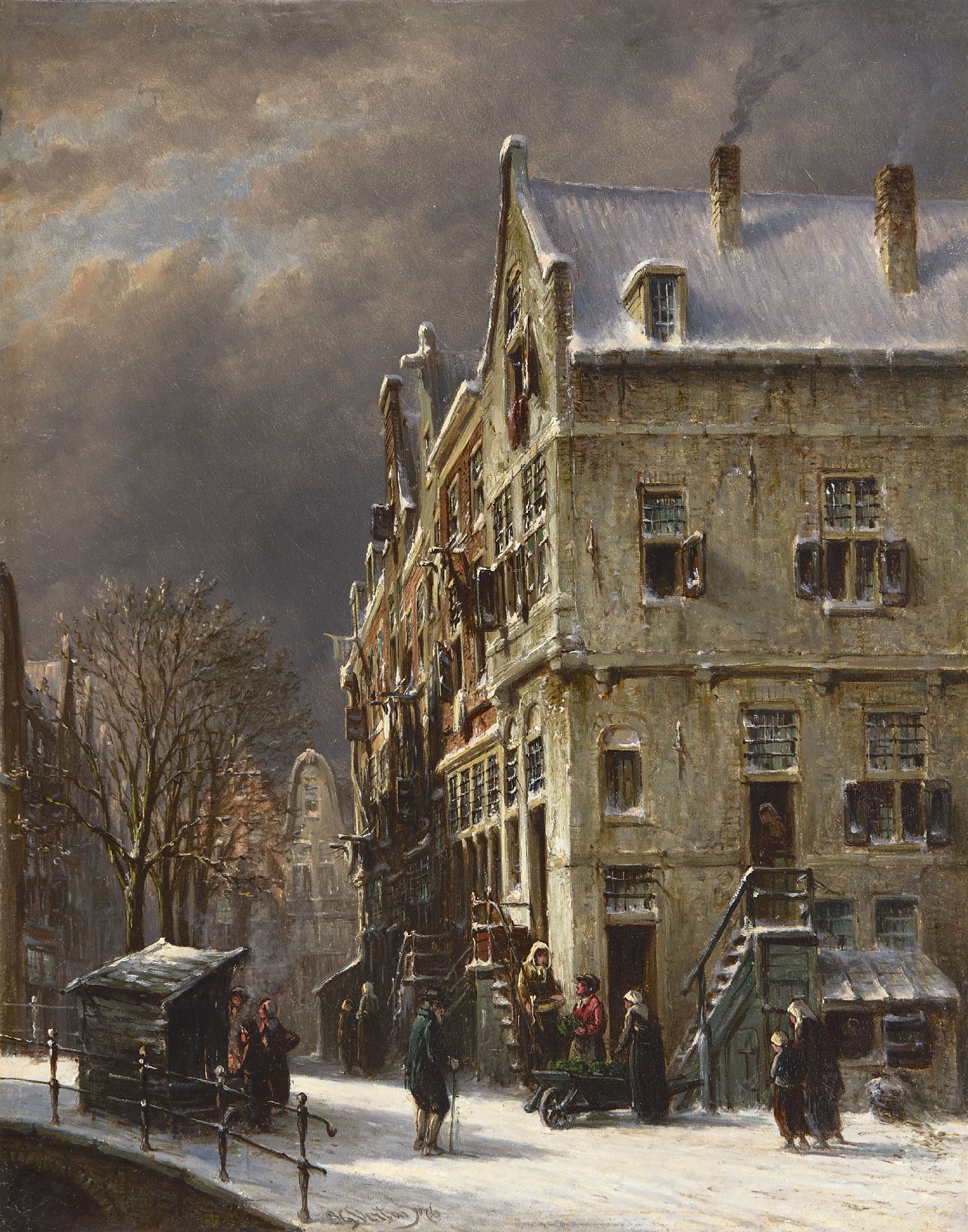 Petrus Gerardus Vertin kunstwerk • schilderij • voorheen te koop Besneeuwd grachtje met stal en groenteverkoper