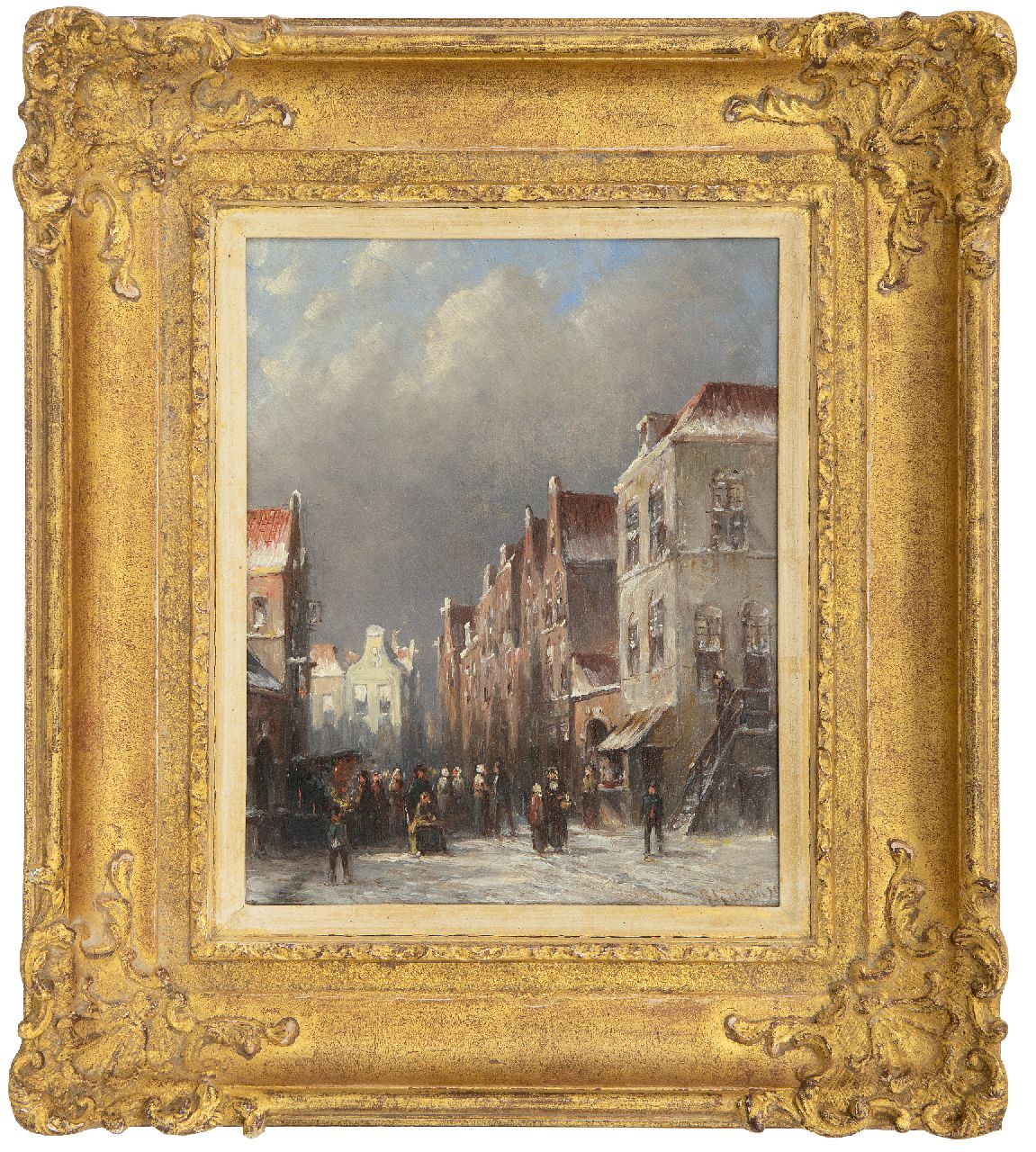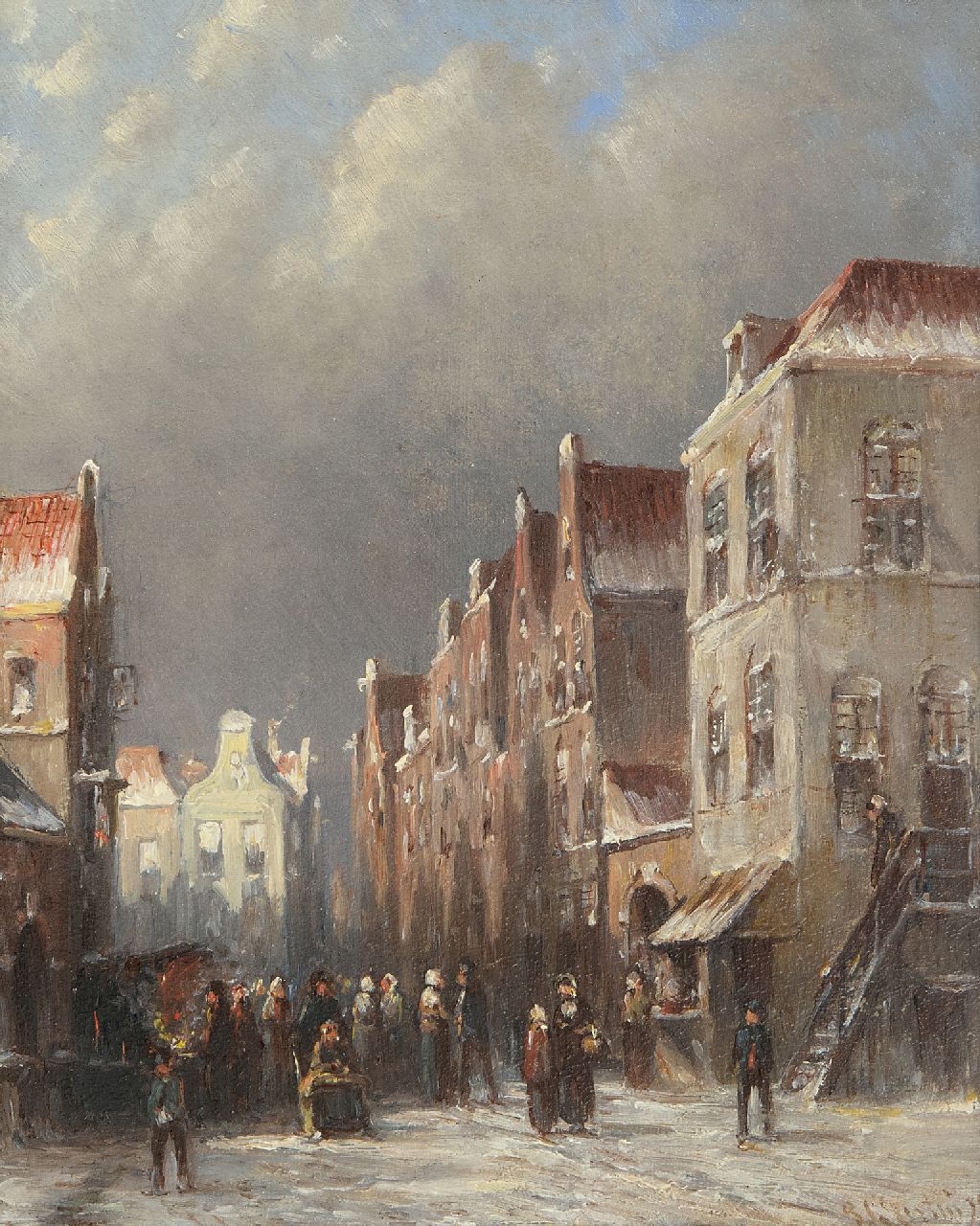 Petrus Gerardus Vertin kunstwerk • schilderij • te koop Drukbevolkt winters straatje met figuren bij een kraam