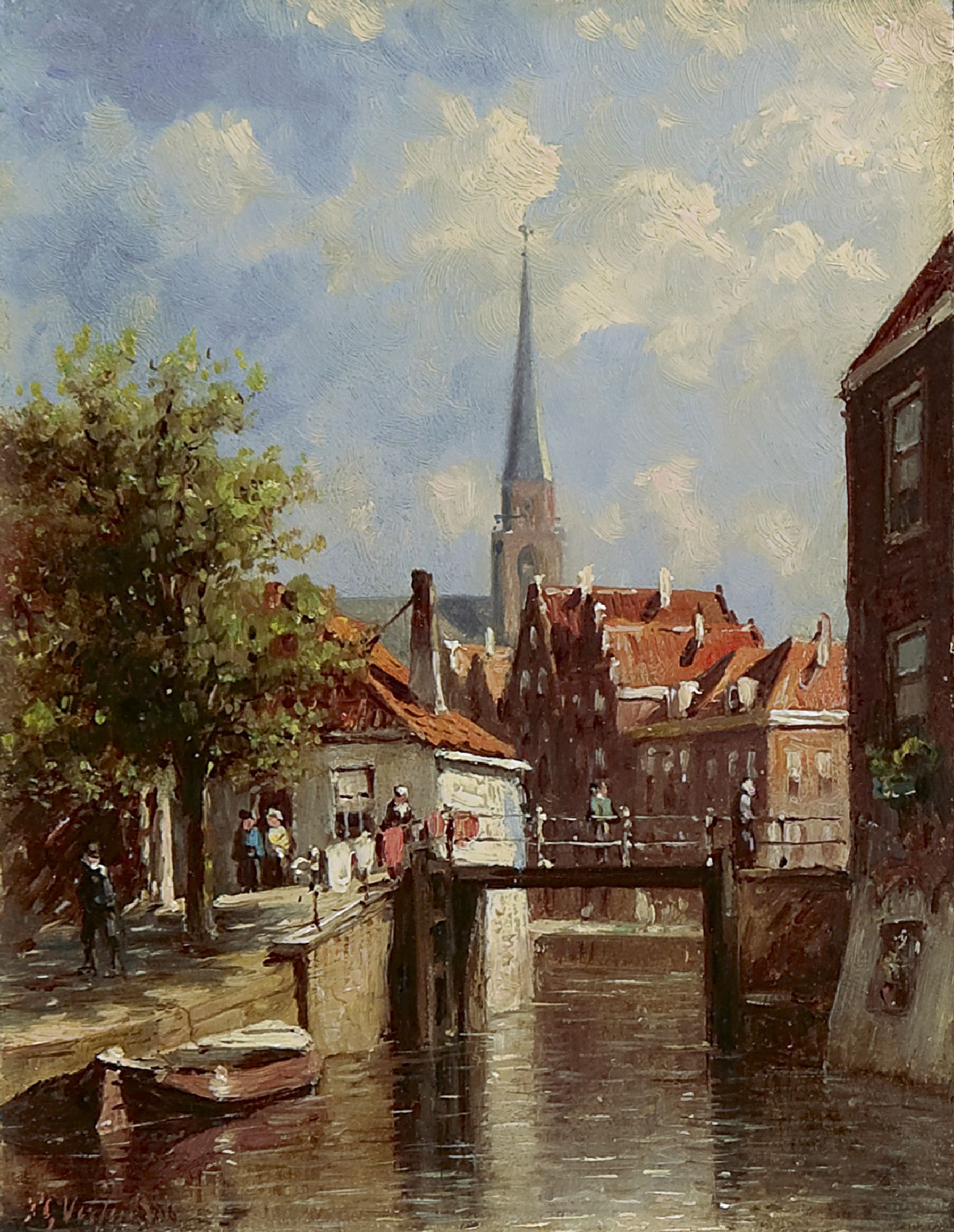 Petrus Gerardus Vertin kunstwerk • schilderij • voorheen te koop Gezicht op de Romeijnbrug met sluisdeuren in Oudewater