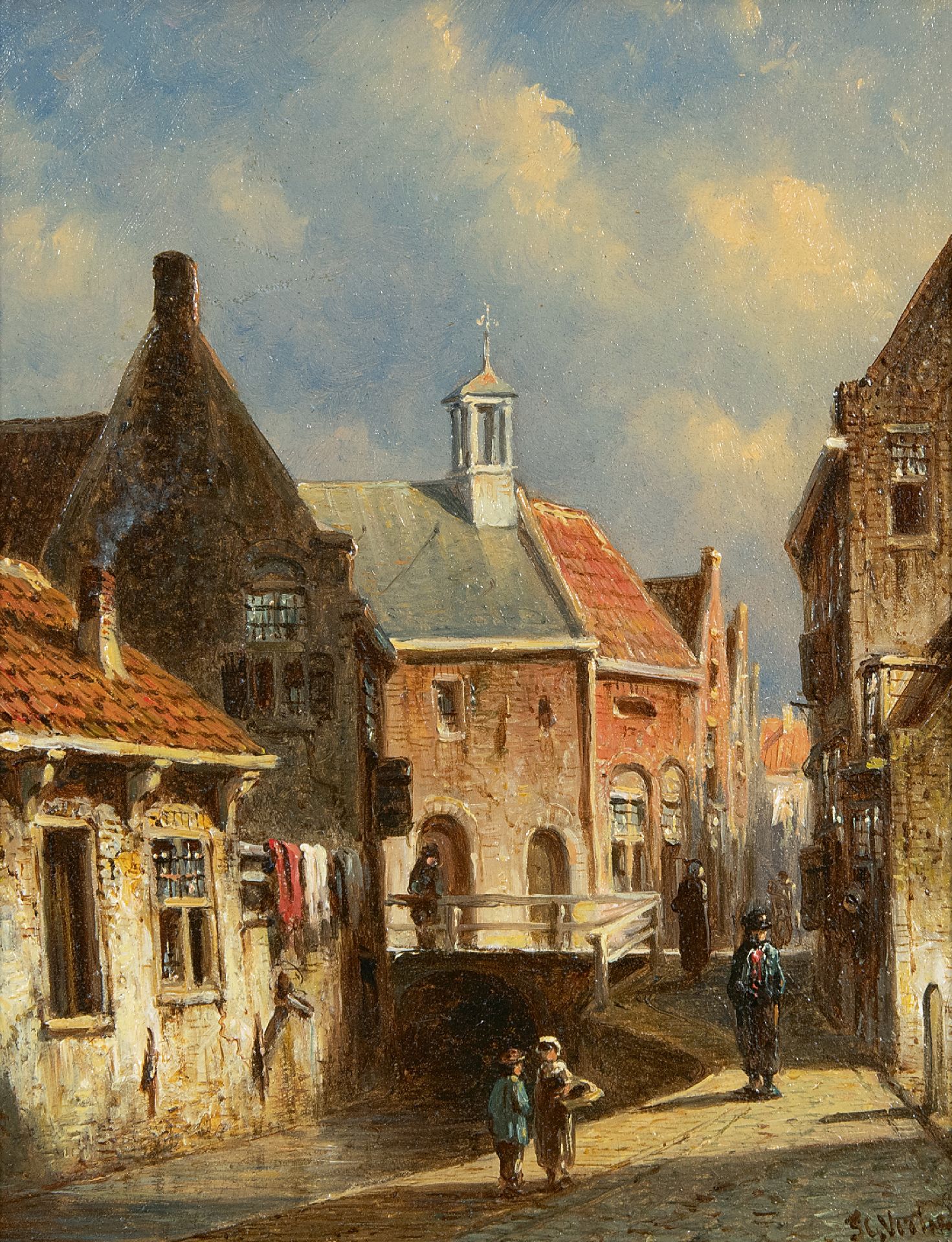 Petrus Gerardus Vertin | Zonnig straatje met groenteverkoopster, olieverf op paneel, 13,4 x 10,2 cm, gesigneerd l.o.