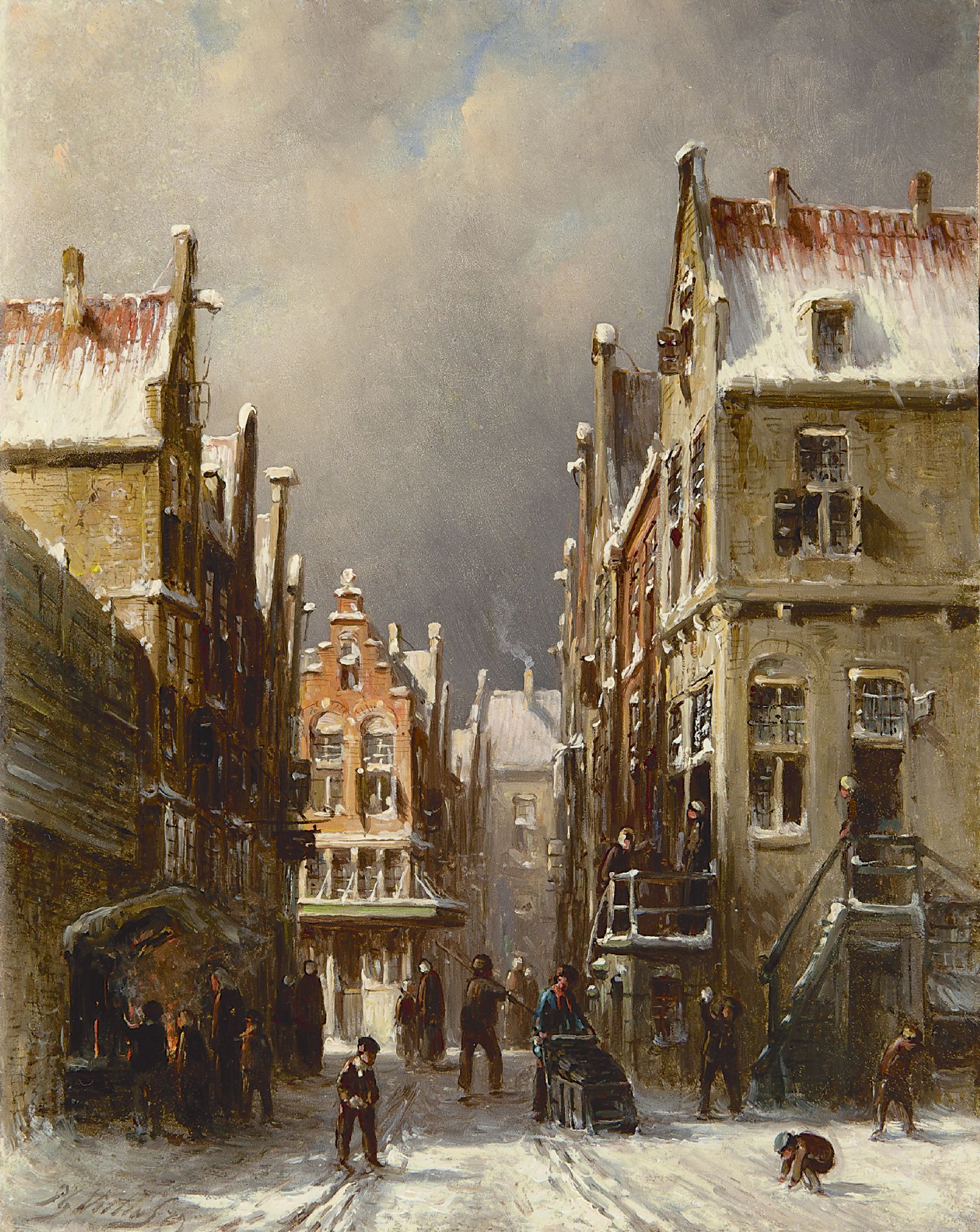 Petrus Gerardus Vertin kreeg zijn opleiding aan de academie van Den Haag waardoor zijn werk gerekend wordt tot de Haagse romantiek. Hij schilderde Hollandse stadsgezichten en straatjes in zomer en winter. Deze liet hij zo nu en dan stofferen door zijn vrienden Charles Rochussen, J.F. Hoppenbrouwers en S.L. Verveer. Soms is zijn werk topografisch, maar meestal koos Vertin voor fantasiebeelden. In zijn wintergezichten besteedde hij veel aandacht aan de weerkaatsing van het licht op besneeuwde daken, kozijnen en stoepen.