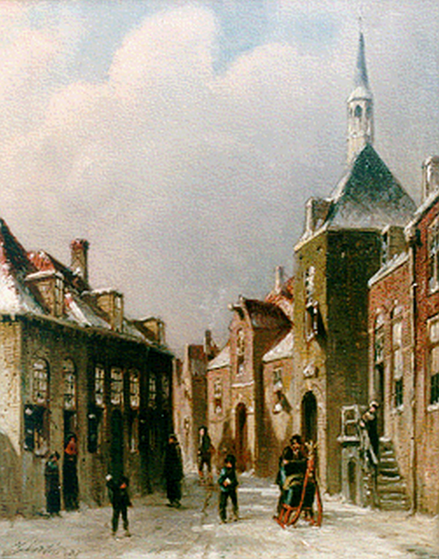 Petrus Gerardus Vertin kunstwerk • schilderij • voorheen te koop Sneeuwpret in winters straatje
