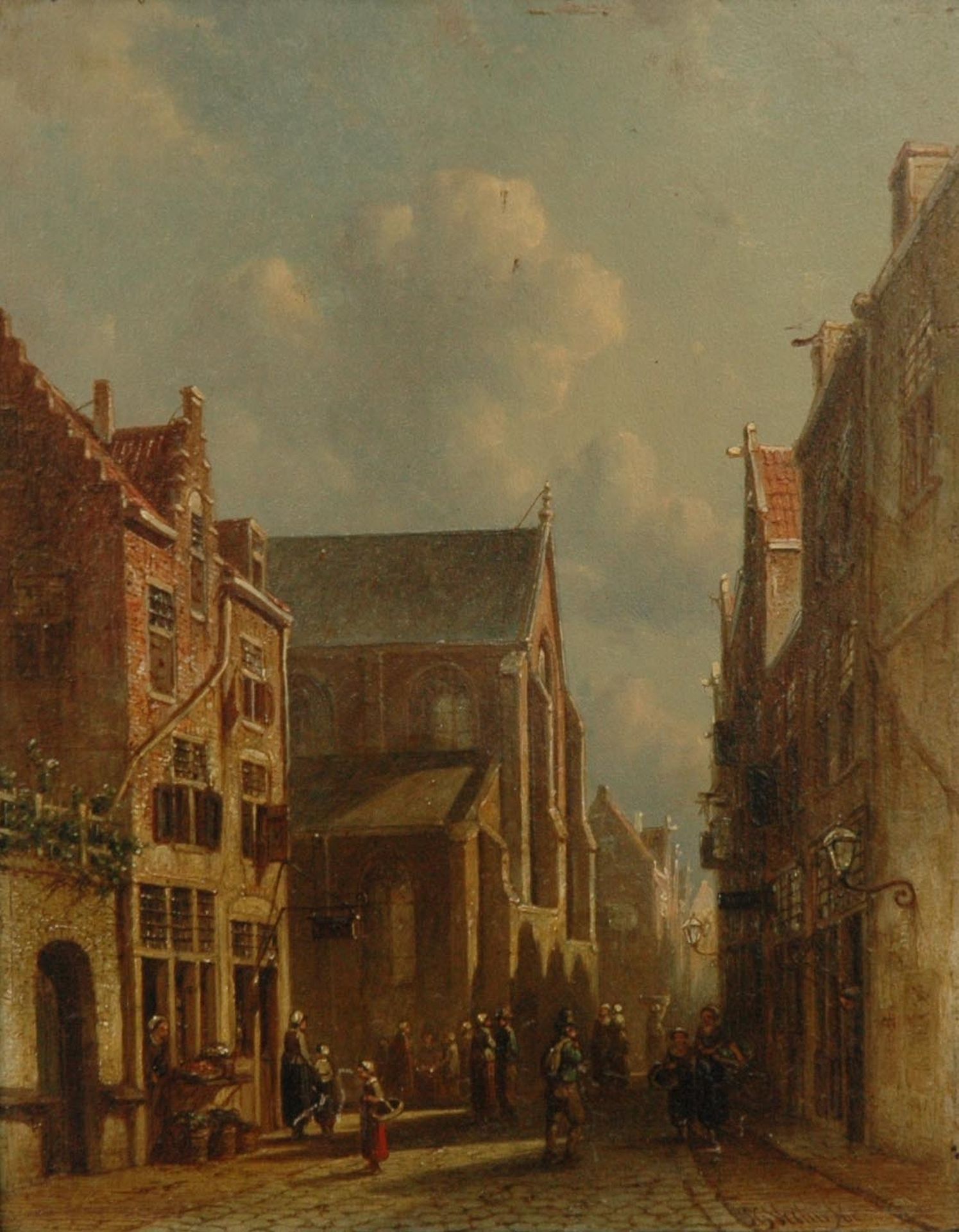 Petrus Gerardus Vertin kunstwerk • schilderij • voorheen te koop Stadsgezicht met figuren bij een kerk (pendant van 14836)