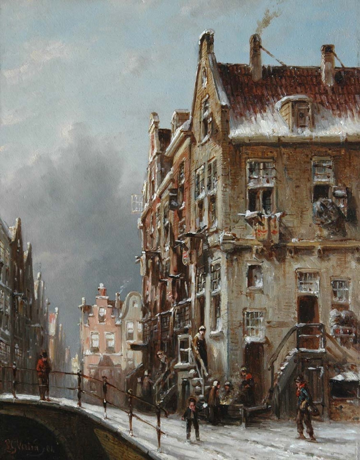 Petrus Gerardus Vertin kunstwerk • schilderij • voorheen te koop Winters straatje met een brug en figuren bij een vuurtje