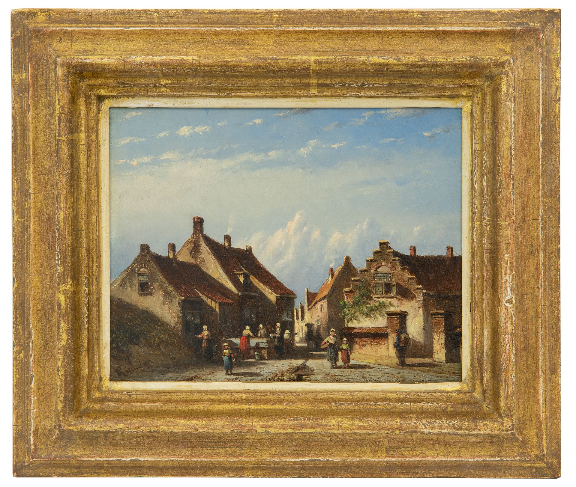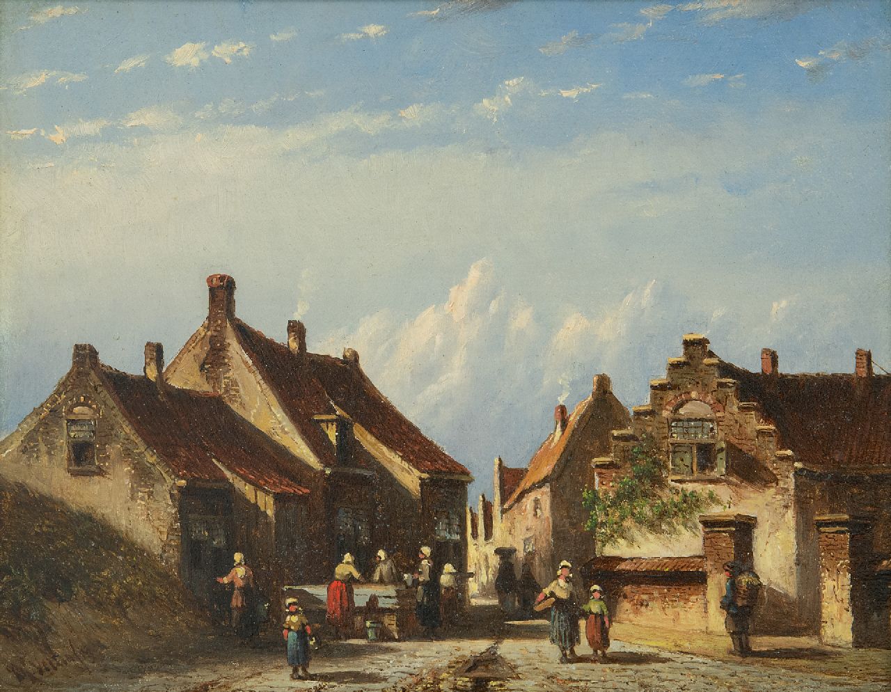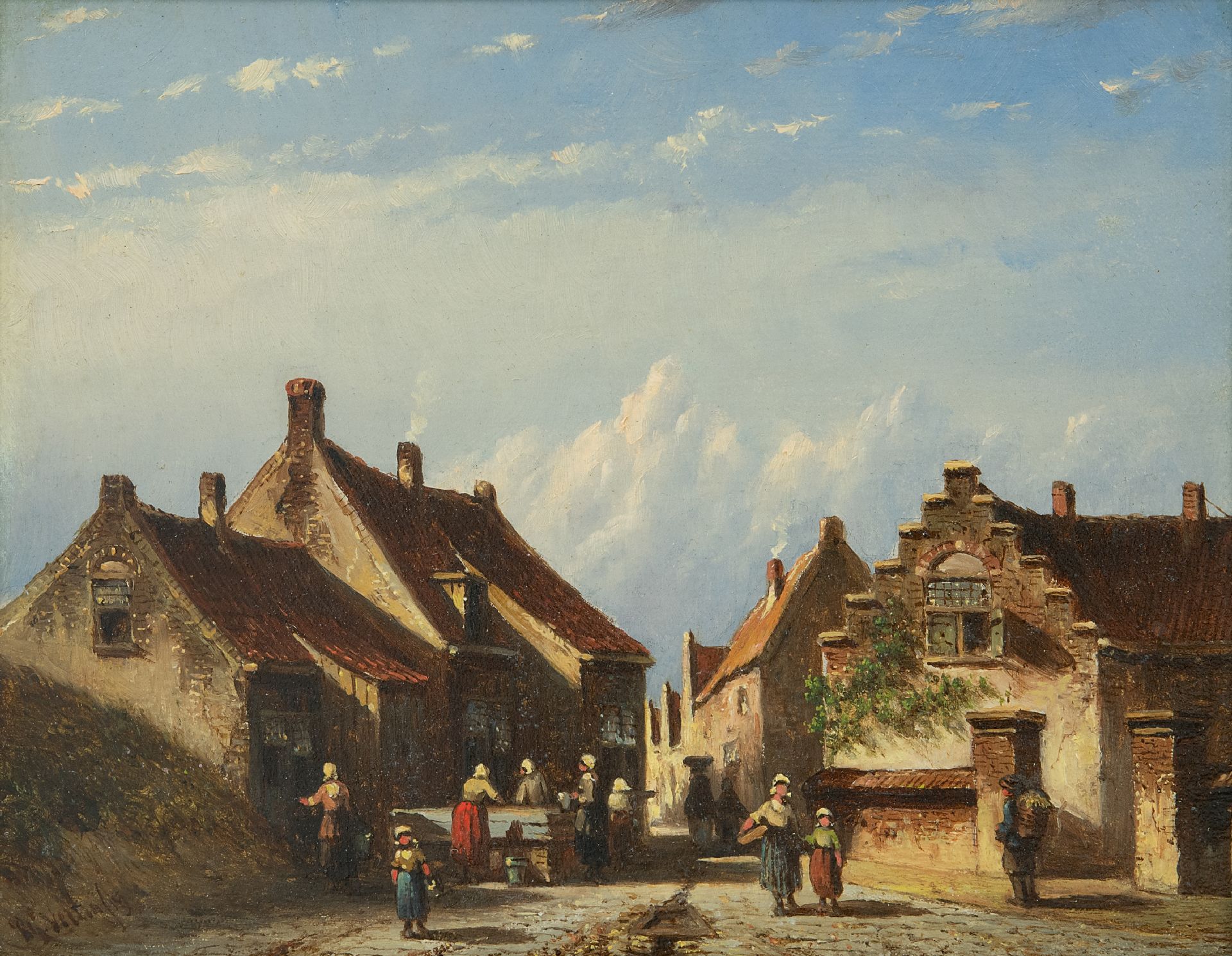 Petrus Gerardus Vertin | Zonnig straatje met groenteverkoopster, olieverf op paneel, 13,4 x 10,2 cm, gesigneerd l.o.