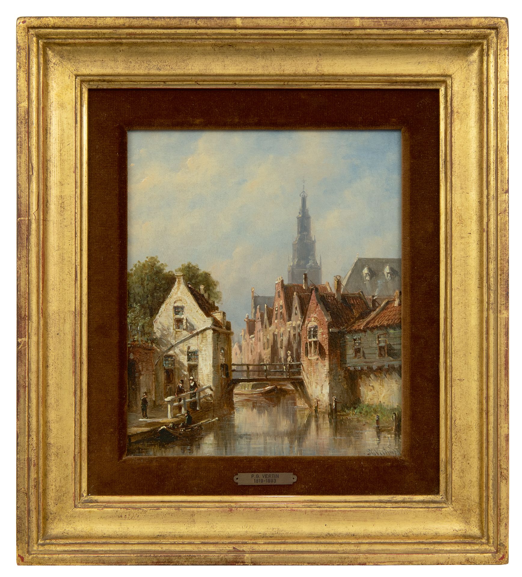 Petrus Gerardus Vertin kunstwerk • schilderij • voorheen te koop Zonnig stadsgrachtje, de Alkmaarse Waagtoren op de achtergrond