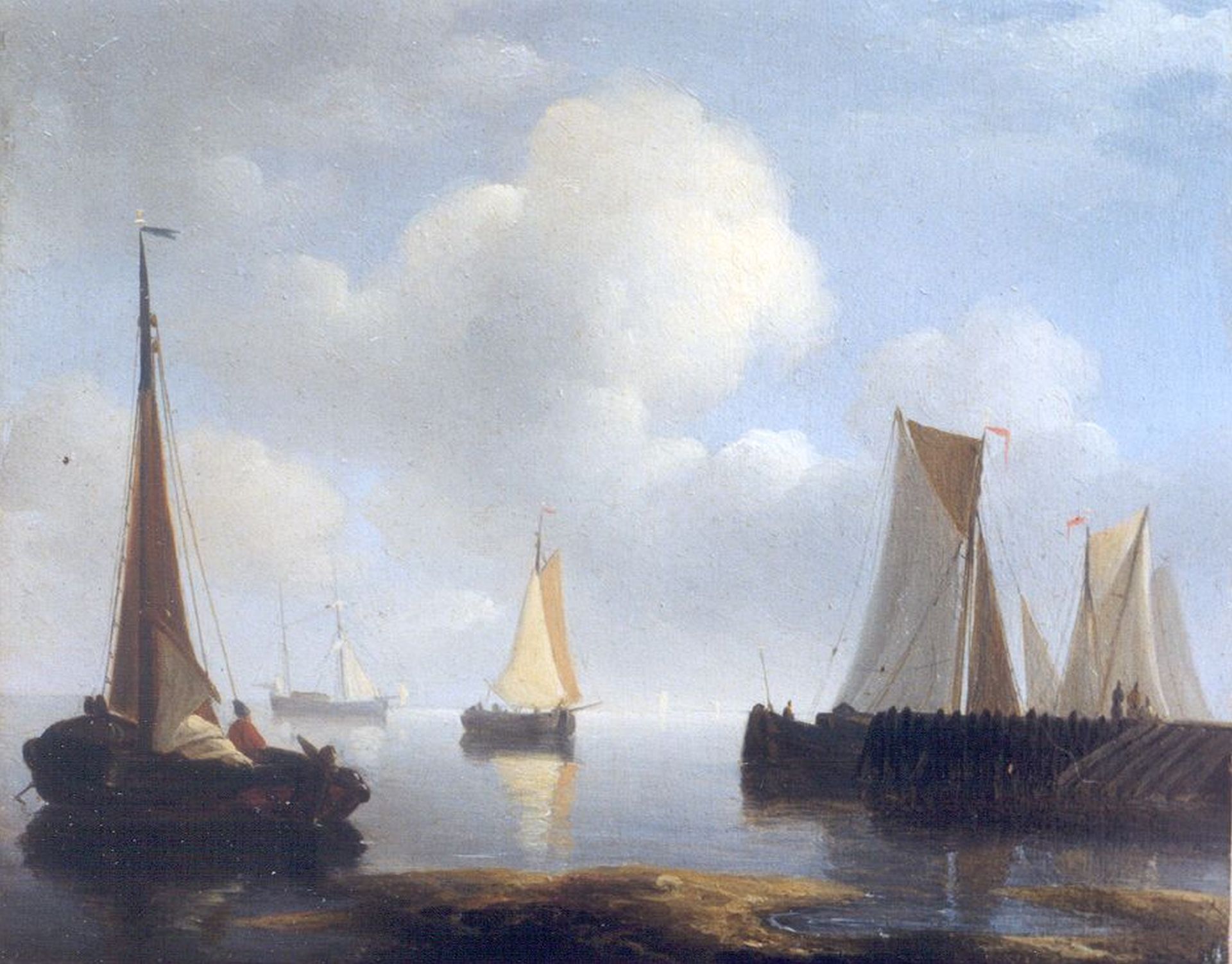 Petrus Johannes Schotel kunstwerk • schilderij • voorheen te koop Zeilschepen in een havenmond bij kalm weer