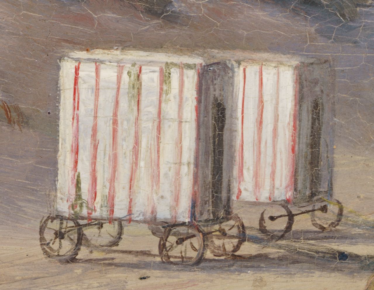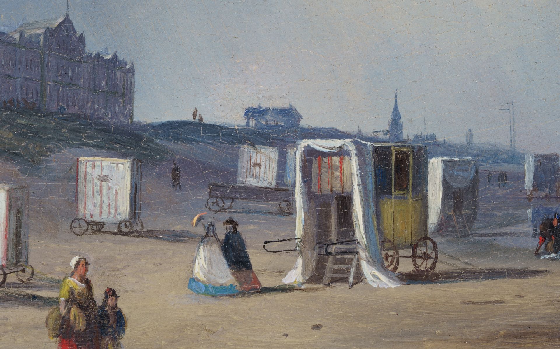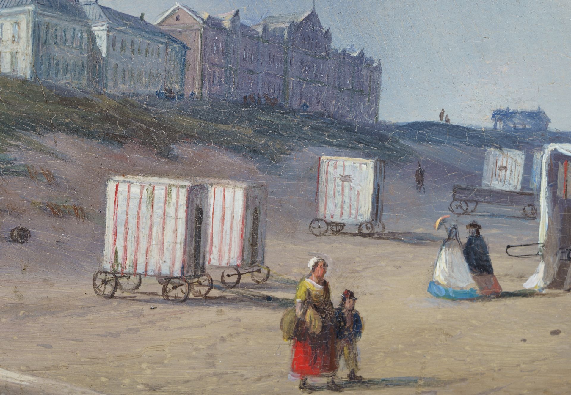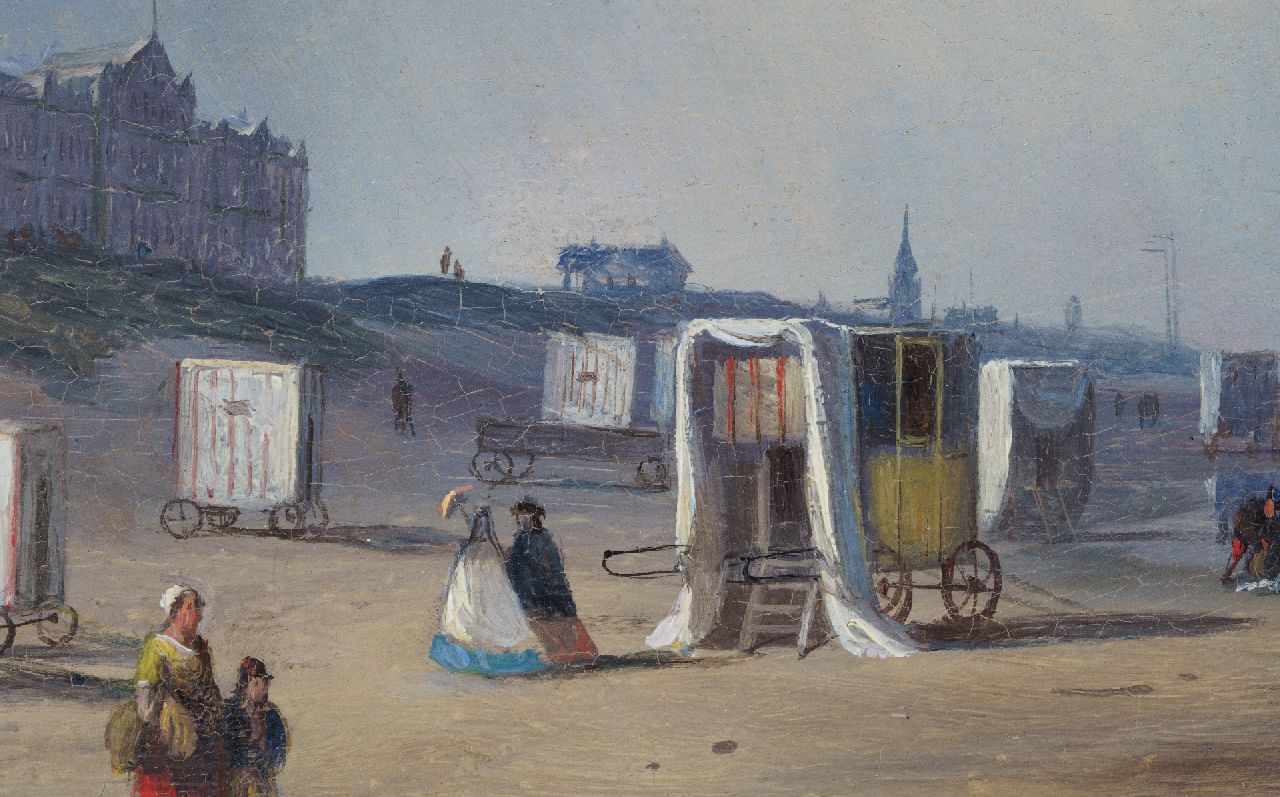P.P. Schiedges, schilder van zee- en riviergezichten, maakte nauwkeurig studie van de scheepstypen waardoor hij ze tot in de kleinste details kon weergeven. In dit Scheveningse strandtafereel laat hij zien dat ook andere zaken hem interesseerden. De grappige badkoetsen bijvoorbeeld, die in allerlei vormen en maten kriskras op het strand staan. Maar ook de duinenrij met zijn ‘architectuurparade' geeft hij zorgvuldig weer. Helemaal links is het gemeentelijke badhuis te zien, dat in 1828 werd geopend. Hier staat tegenwoordig het Kurhaus. Het roodstenen pand ernaast is Hotel Garni, dat in 1974 werd afgebroken. Het werd gebouwd op de plek waar eerst badhuis ‘Pronkenburg’ van Jacob Pronk, de ‘pionier van het Nederlandse badleven’, had gestaan. Het witte gebouwtje rechts in de verte, richting de kerk van Scheveningen, is het Paviljoen Von Wied. Dit werd in 1826 gebouwd in opdracht van koning Willem I, die met dit huis aan zee de zwakke gezondheid van zijn echtgenote Wilhelmina van Pruisen hoopte te verbeteren. Een van zijn kleinkinderen, Prinses Marie van Oranje-Nassau, erfde het paviljoen in 1881. Aan haar echtgenoot, prins Wilhem von Wied, dankt het gebouw zijn naam. Het paviljoen staat er nog steeds en in het duin rondom is nu het Museum Beelden aan Zee gevestigd.