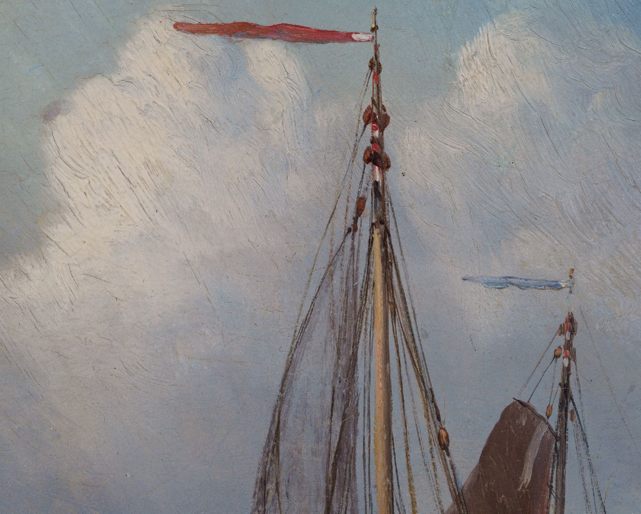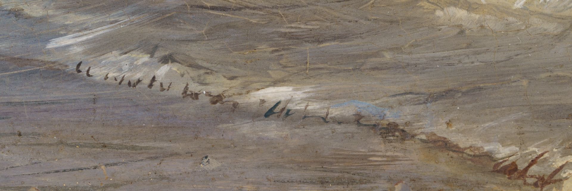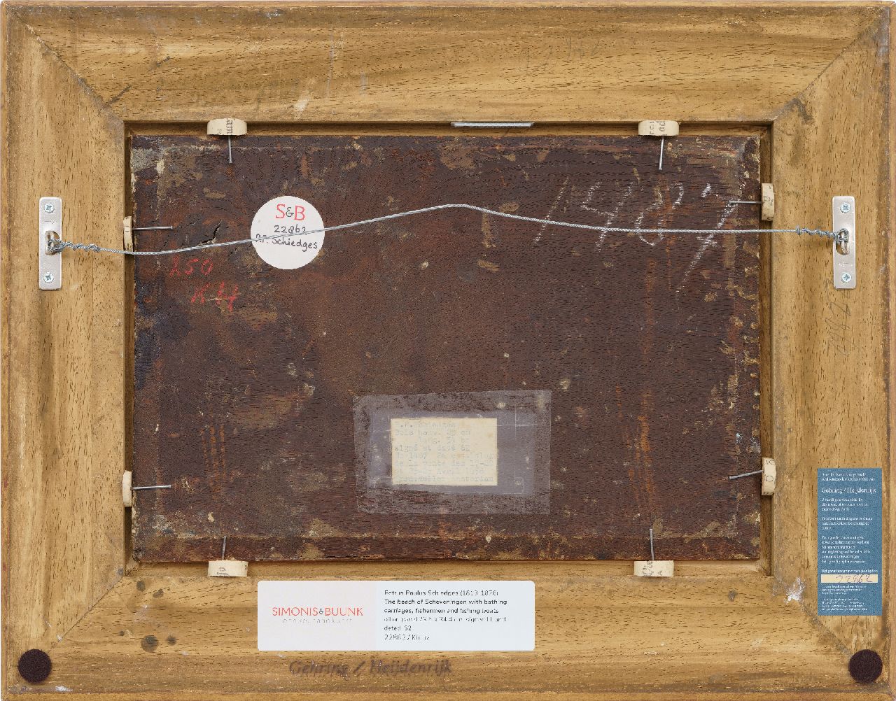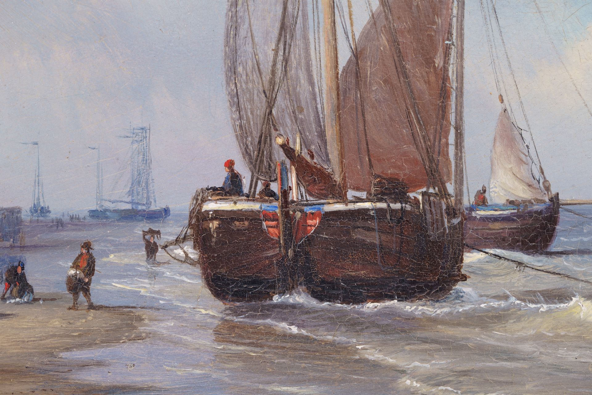 P.P. Schiedges, schilder van zee- en riviergezichten, maakte nauwkeurig studie van de scheepstypen waardoor hij ze tot in de kleinste details kon weergeven. In dit Scheveningse strandtafereel laat hij zien dat ook andere zaken hem interesseerden. De grappige badkoetsen bijvoorbeeld, die in allerlei vormen en maten kriskras op het strand staan. Maar ook de duinenrij met zijn ‘architectuurparade' geeft hij zorgvuldig weer. Helemaal links is het gemeentelijke badhuis te zien, dat in 1828 werd geopend. Hier staat tegenwoordig het Kurhaus. Het roodstenen pand ernaast is Hotel Garni, dat in 1974 werd afgebroken. Het werd gebouwd op de plek waar eerst badhuis ‘Pronkenburg’ van Jacob Pronk, de ‘pionier van het Nederlandse badleven’, had gestaan. Het witte gebouwtje rechts in de verte, richting de kerk van Scheveningen, is het Paviljoen Von Wied. Dit werd in 1826 gebouwd in opdracht van koning Willem I, die met dit huis aan zee de zwakke gezondheid van zijn echtgenote Wilhelmina van Pruisen hoopte te verbeteren. Een van zijn kleinkinderen, Prinses Marie van Oranje-Nassau, erfde het paviljoen in 1881. Aan haar echtgenoot, prins Wilhem von Wied, dankt het gebouw zijn naam. Het paviljoen staat er nog steeds en in het duin rondom is nu het Museum Beelden aan Zee gevestigd.