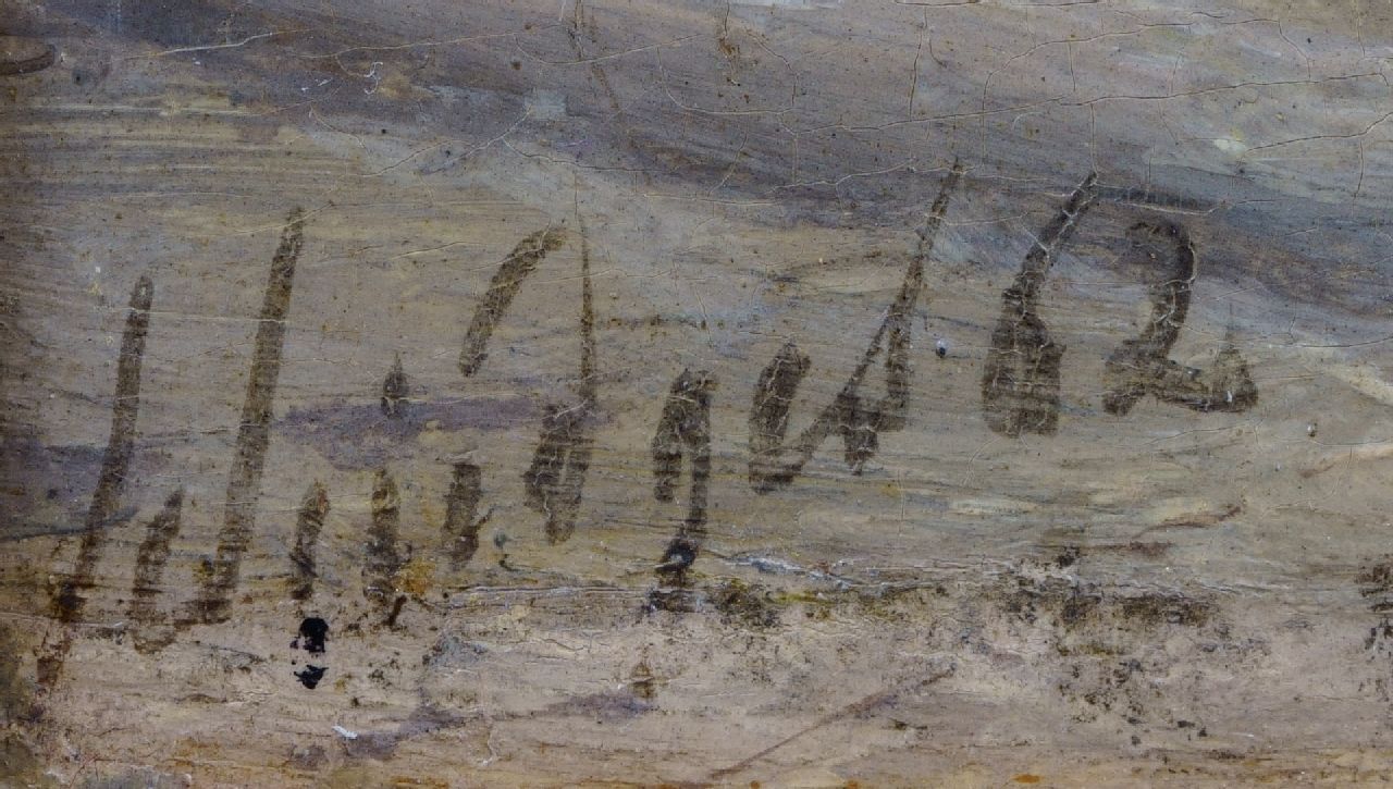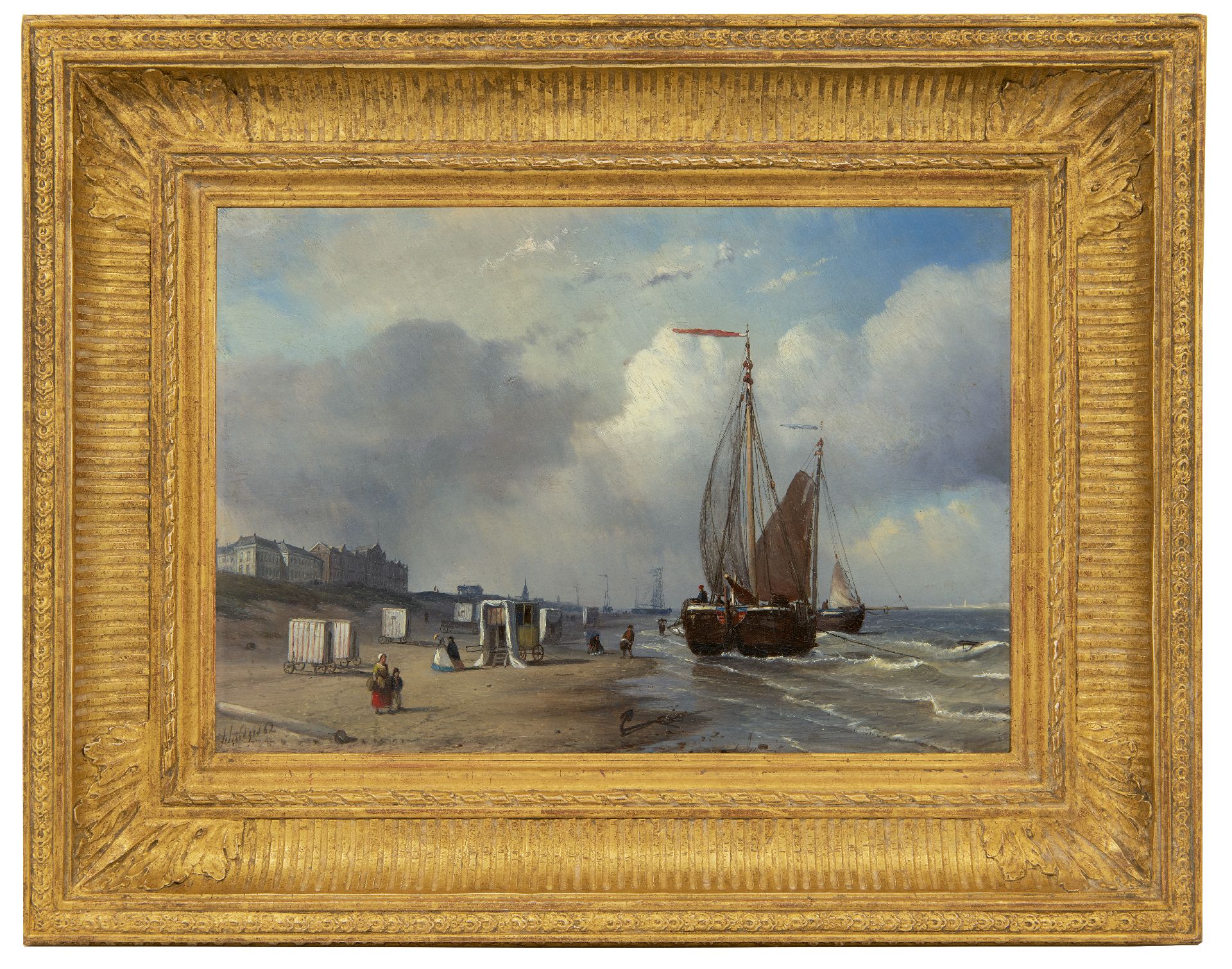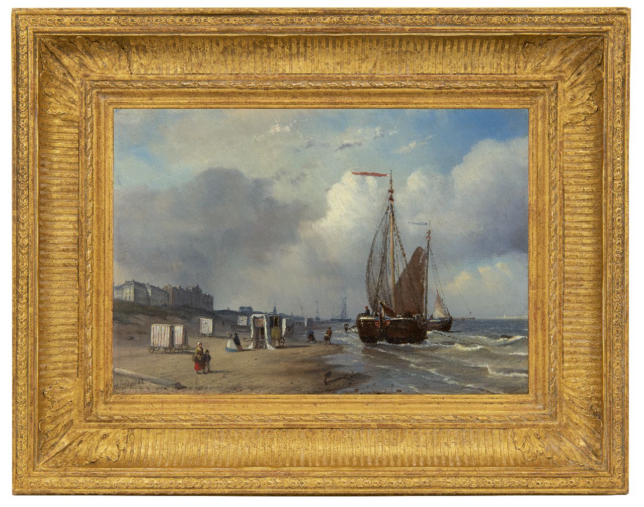 Petrus Paulus Schiedges kunstwerk • schilderij • te koop Het strand van Scheveningen met badkoetsen, vissersvolk en bomschuiten
