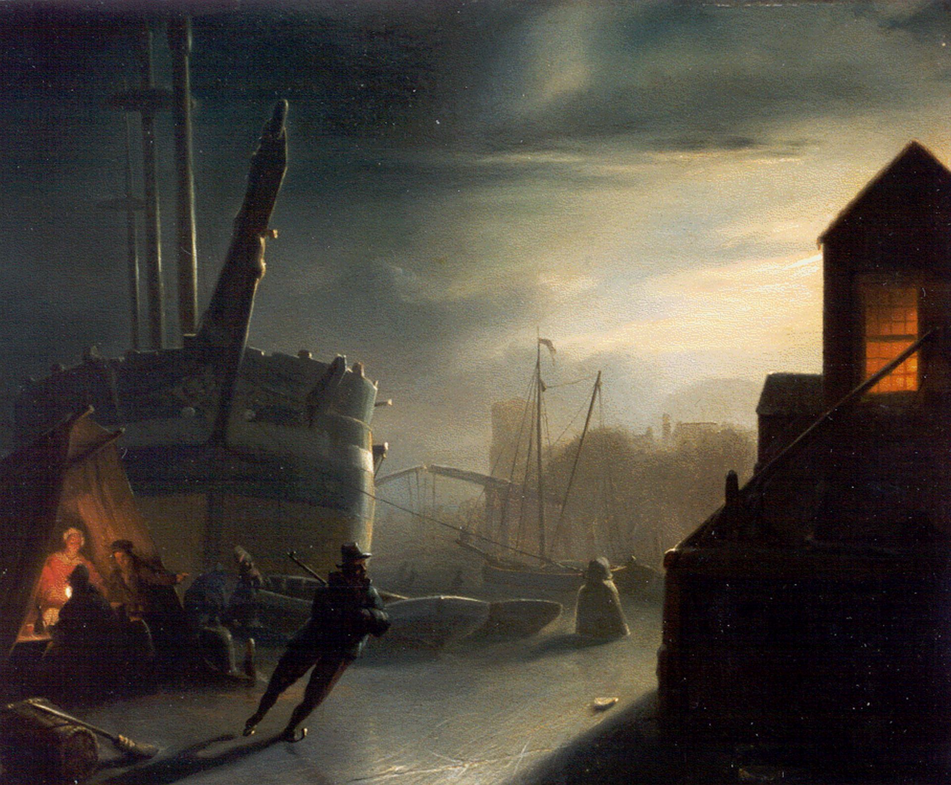 Petrus van Schendel kunstwerk • schilderij • voorheen te koop Bevroren stadsgracht bij maanlicht