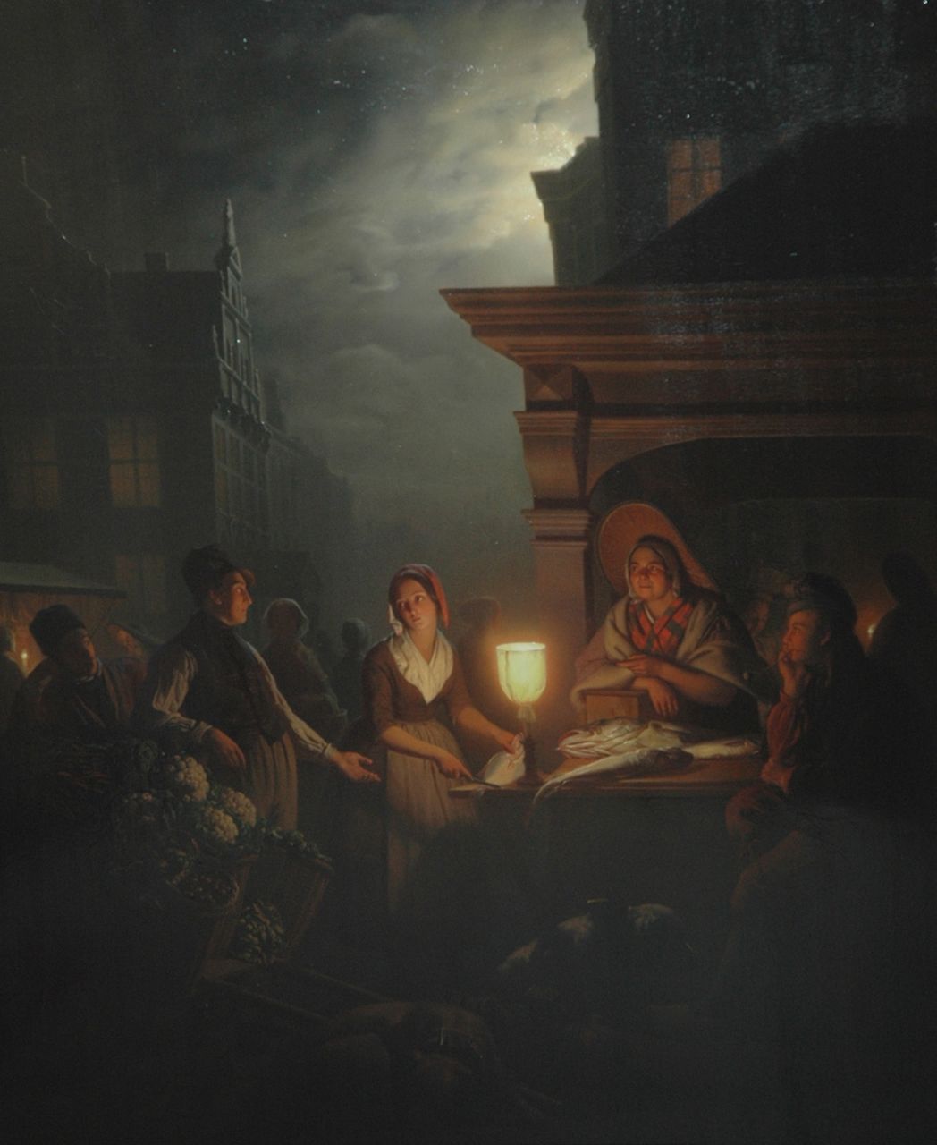 De Belgisch-Nederlandse schilder Petrus van Schendel verwierf grote bekendheid met zijn maanverlichte landschappen en nachtelijke markten waarin kaarslicht en open vuur de lichtbron vormden. Het genre beantwoordde aan de fascinatie van de romantische verzamelaar voor de duisternis en de geheimzinnige krachten van de natuur. De kaarslichtscènes van de schilder werden zó bewonderd dat men hem in Frankrijk 'Monsieur Chandelle' noemde. Van Schendel schilderde ook Bijbelse voorstellingen en enkele portretten.