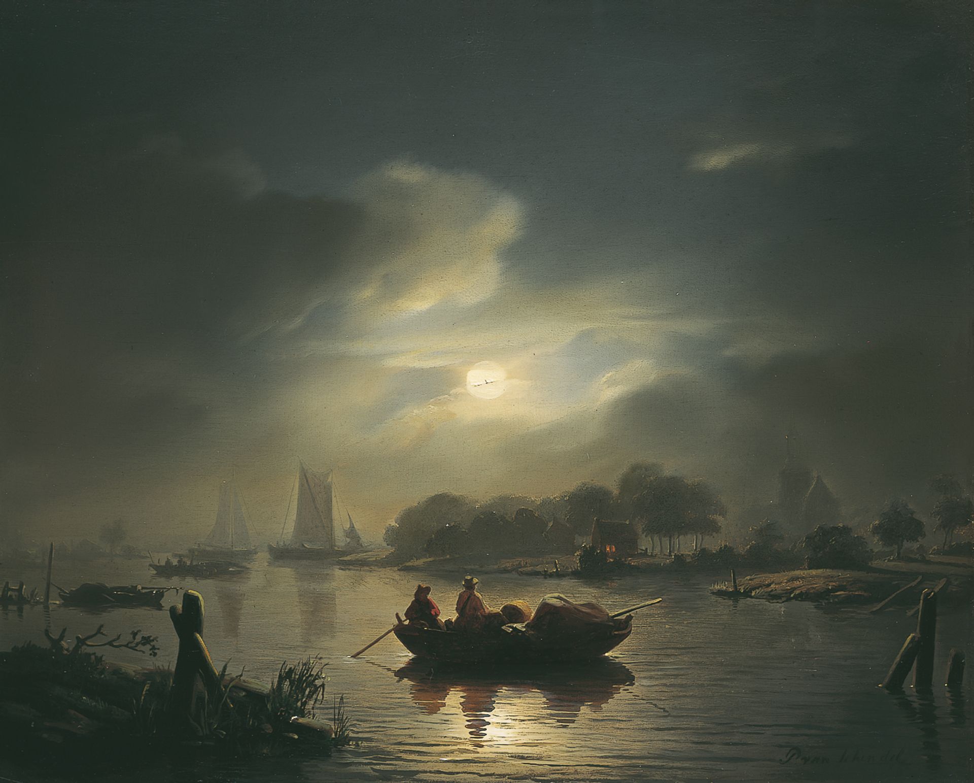 Petrus van Schendel kunstwerk • schilderij • voorheen te koop Riviergezicht bij maanlicht