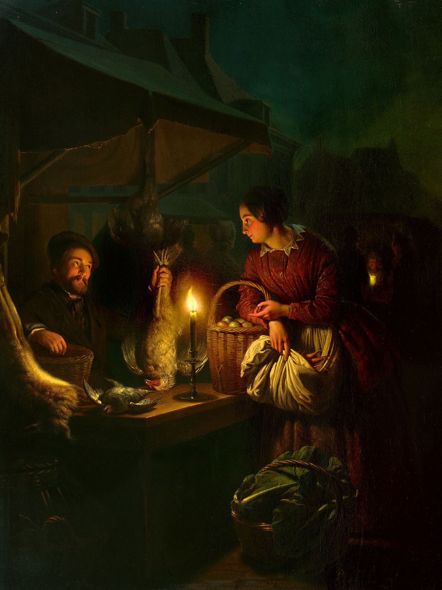 De Belgisch-Nederlandse schilder Petrus van Schendel verwierf grote bekendheid met zijn maanverlichte landschappen en nachtelijke markten waarin kaarslicht en open vuur de lichtbron vormden. Het genre beantwoordde aan de fascinatie van de romantische verzamelaar voor de duisternis en de geheimzinnige krachten van de natuur. De kaarslichtscènes van de schilder werden zó bewonderd dat men hem in Frankrijk 'Monsieur Chandelle' noemde. Van Schendel schilderde ook Bijbelse voorstellingen en enkele portretten.