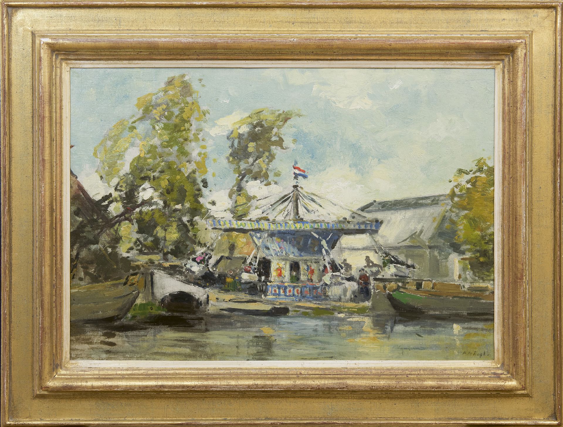 Piet de Regt kunstwerk • schilderij • voorheen te koop Zweefmolen aan de waterkant