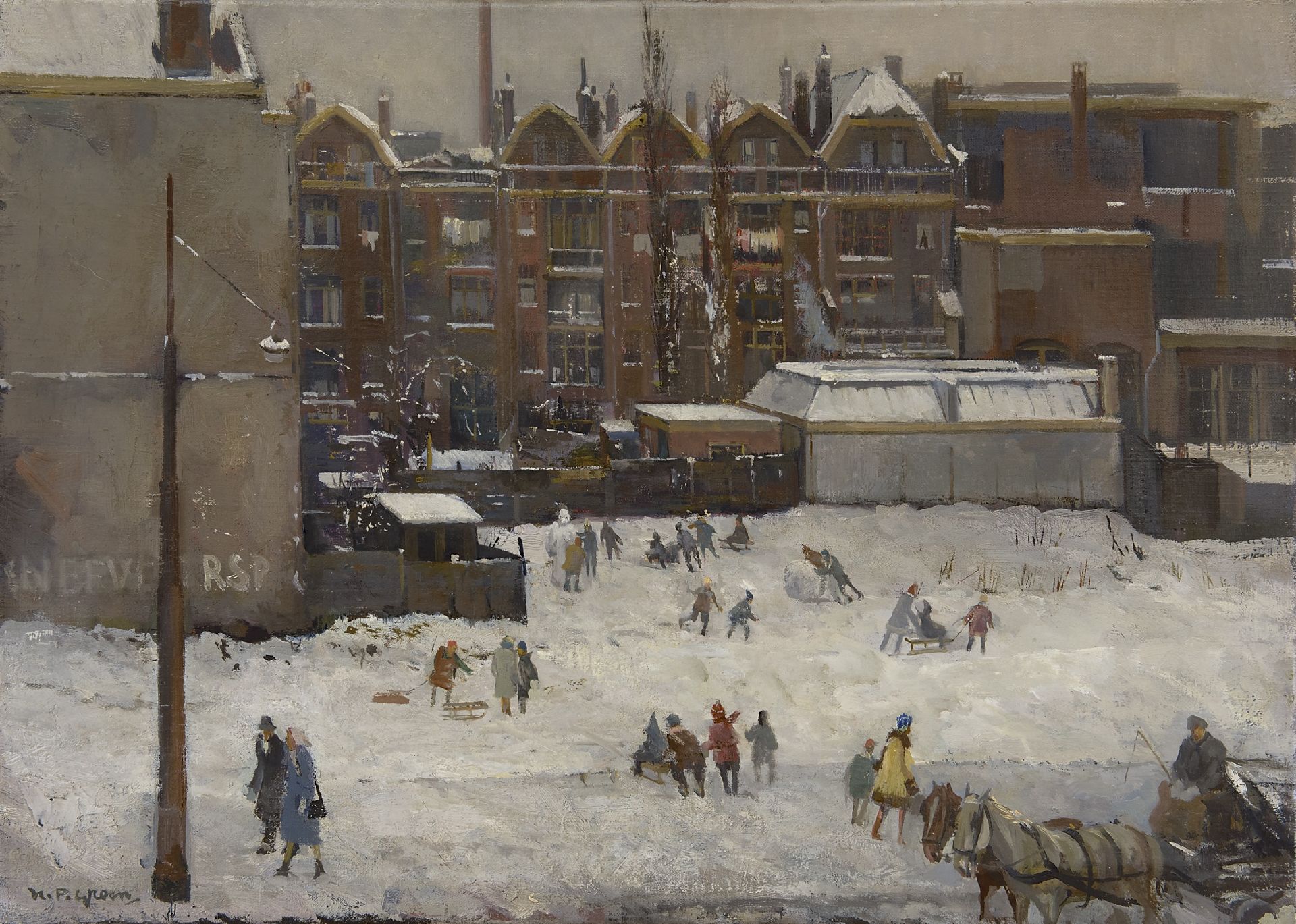 Piet Groen kunstwerk • schilderij • voorheen te koop Sneeuwpret in Rotterdam (waarschijnllijk langs de brandgrens van 14 mei 1940)